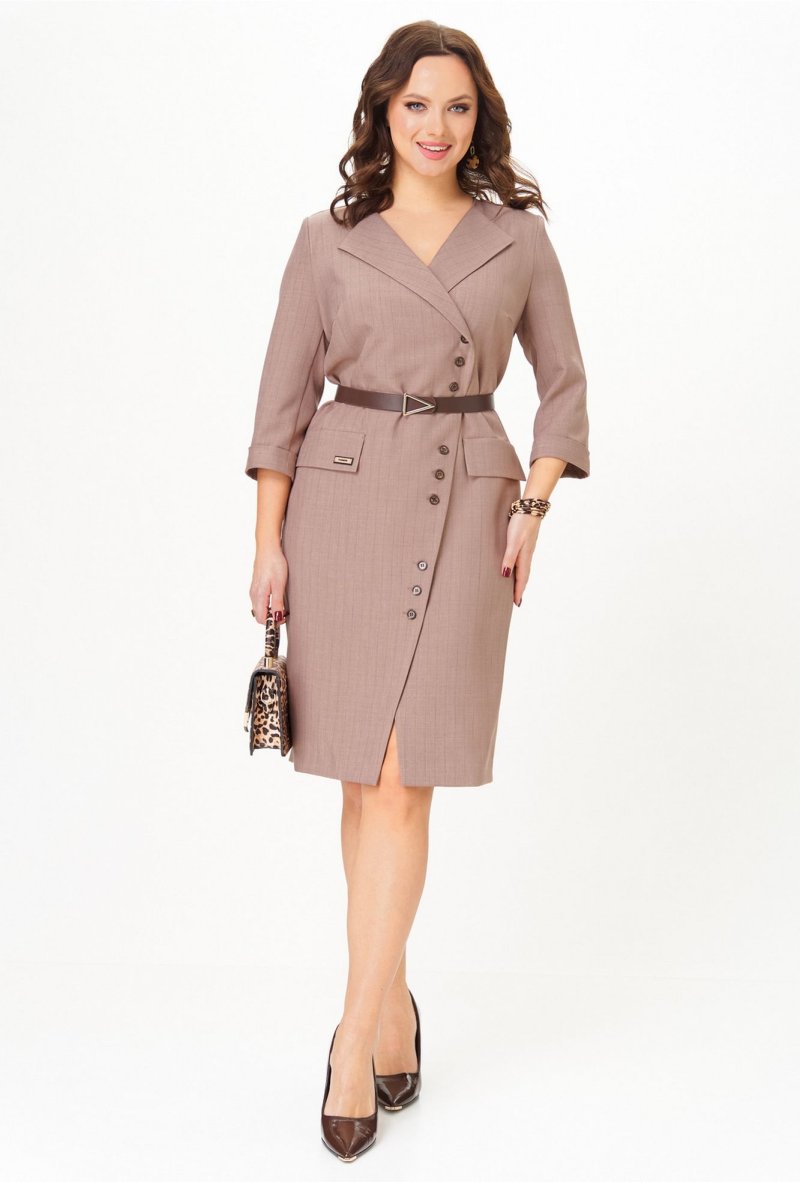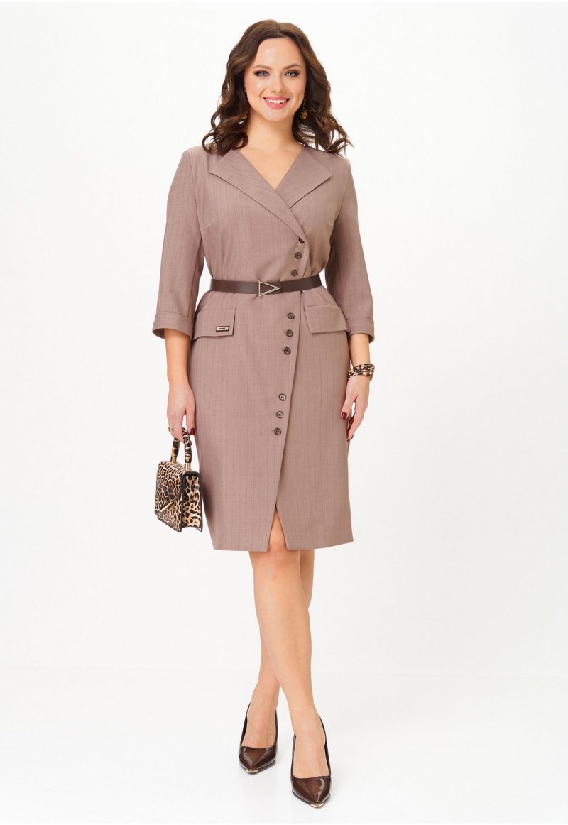 Элегантное платье полуприлегающего силуэта с асимметричной застежкой на петли и пуговицы. Перед платья с нагрудными вытачками и клапанами в области бёдер. Спинка с талиевыми вытачками и средним швом, внизу которого обработана шлица. Застежка асимметричная, двубортная, по низу платья расходится на разрез. В области плеч — погоны, закрепляющиеся на пуговицу. Рукава двухшовные втачные, длиной 3/4, с притачной манжетой. Платье с плечевыми накладками и со съёмным ремнем в цвет фурнитуры. Фурнитура и комплектующие (ремень) могут незначительно отличаться от представленных на фото.