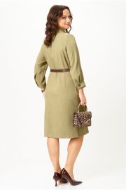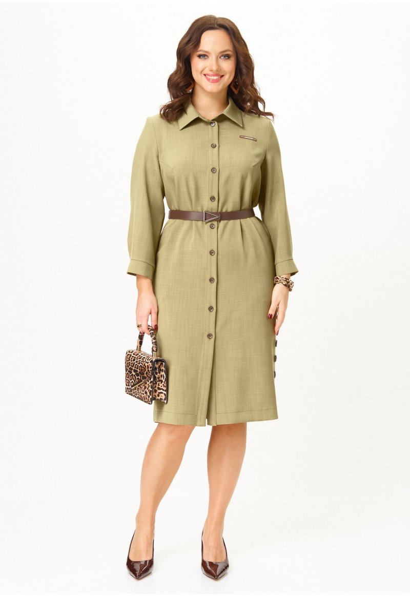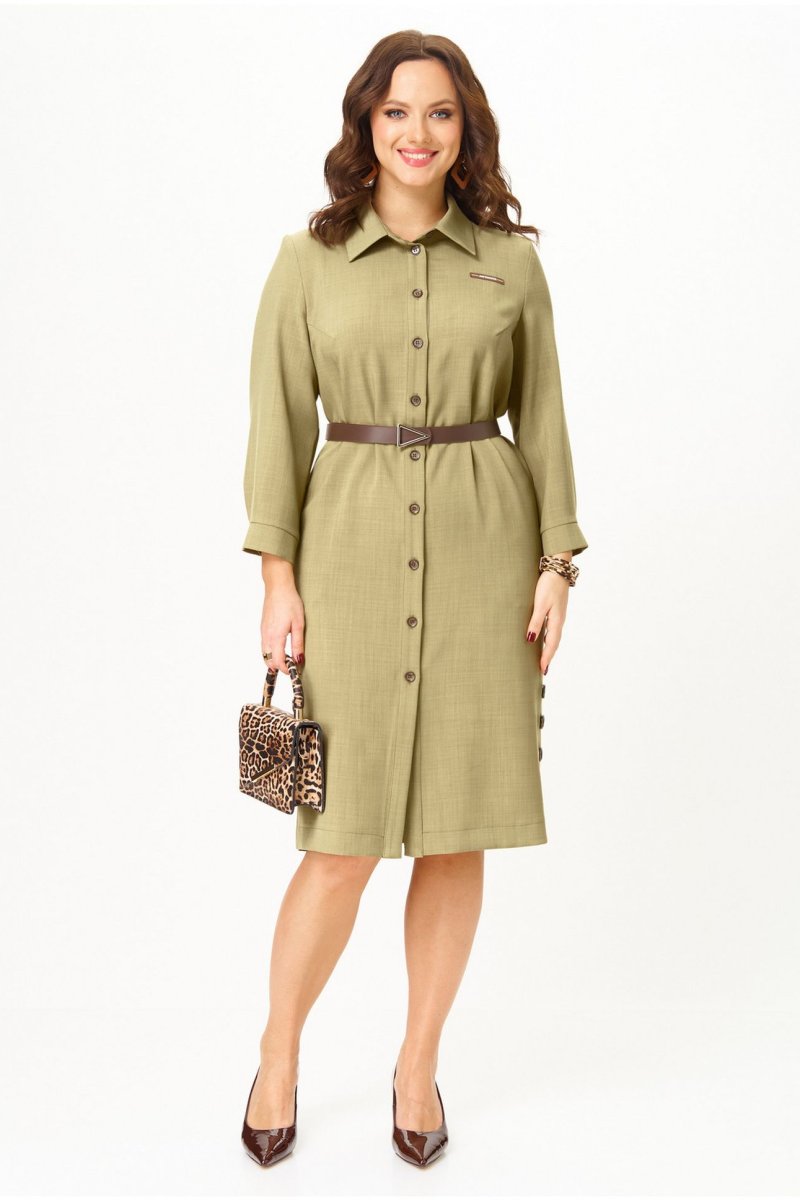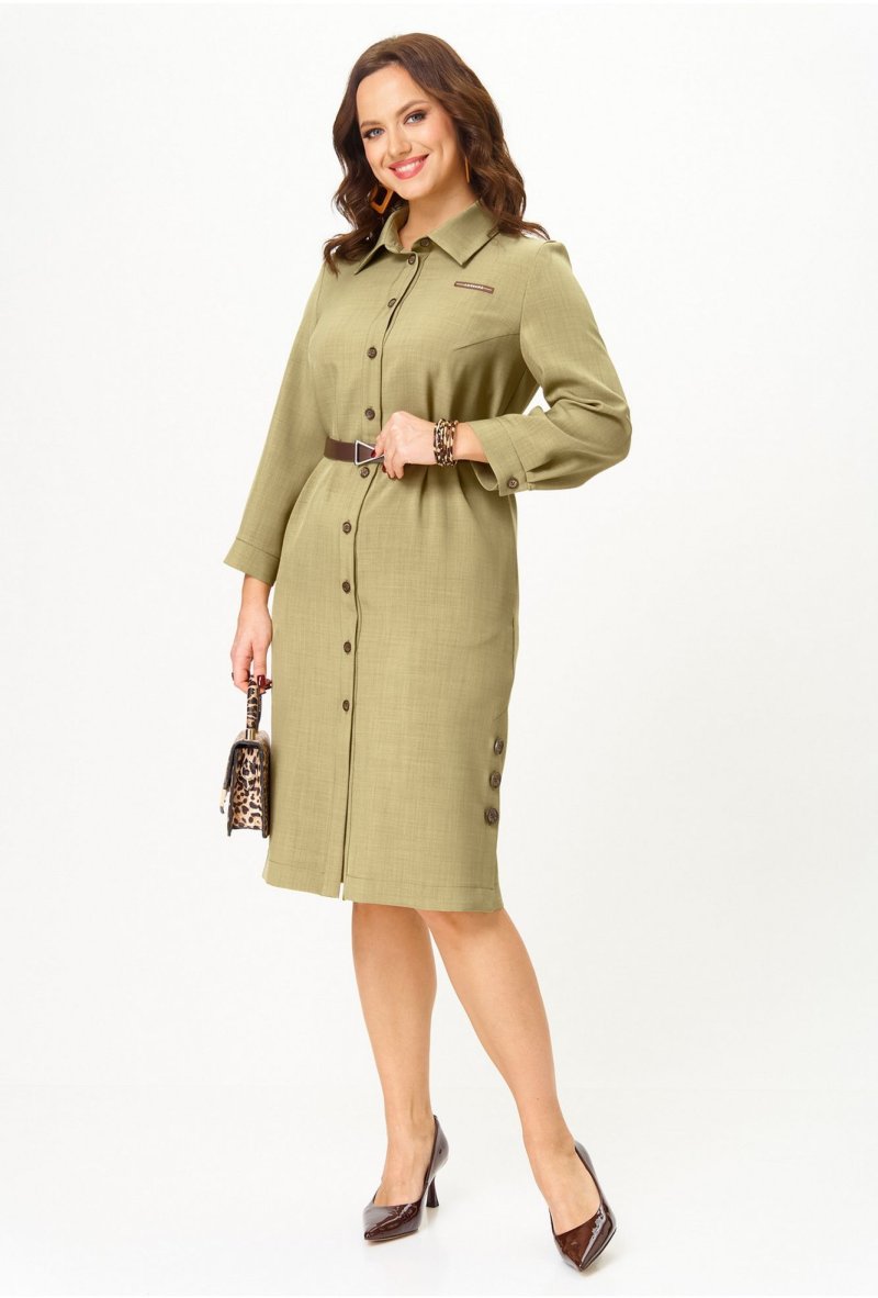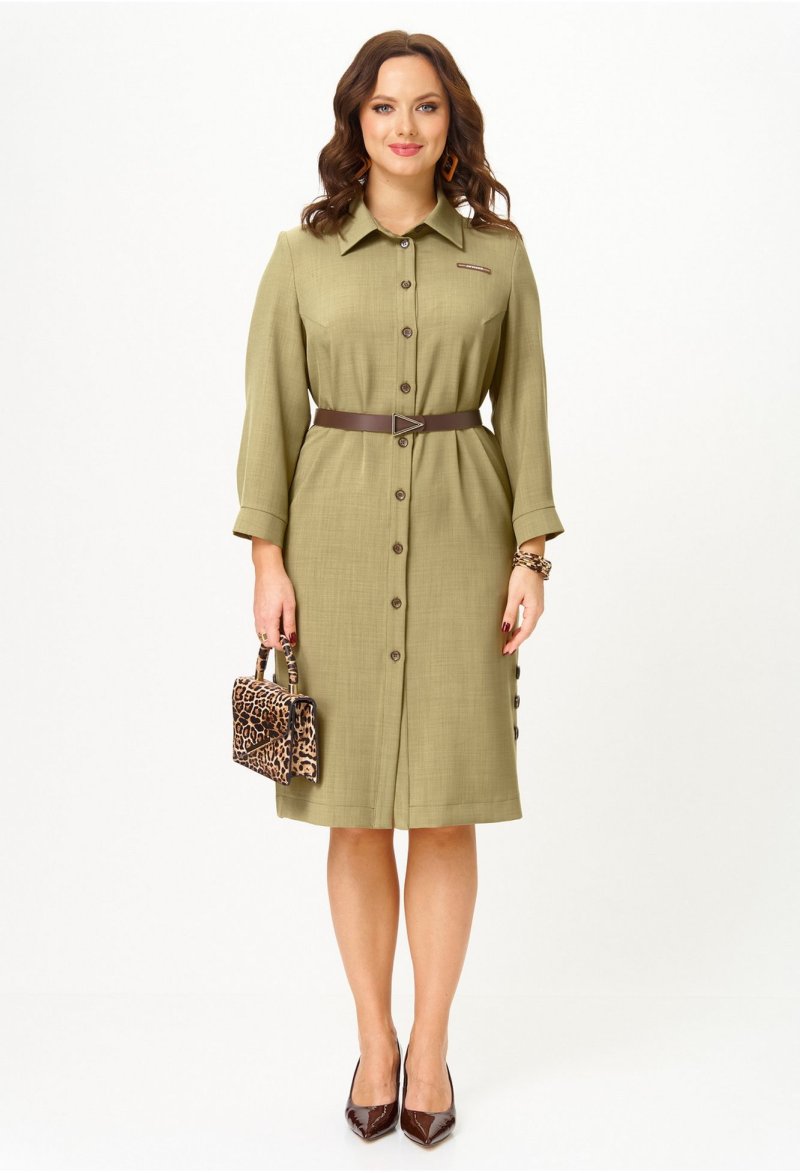 "Платье-рубашка полуприлегающего силуэта, длиной миди, выполненое из поливискозы. Перед с нагрудными вытачками и центральной застёжкой на петли и пуговицы на притачной планке. В области груди расположена декоративная нашивка. Горловина обработана воротником рубашечного типа. Спинка цельнокроеная с талиевыми вытачками. Рукав втачной, длиной 3/4, с притачной манжетой, застегивающейся на петлю и пуговицу. В нижней части боковых швов обработаны шлицы, которые застегиваются на петли и пуговицы. В боковых швах в области бедер обработаны карманы. В комплекте ремень.