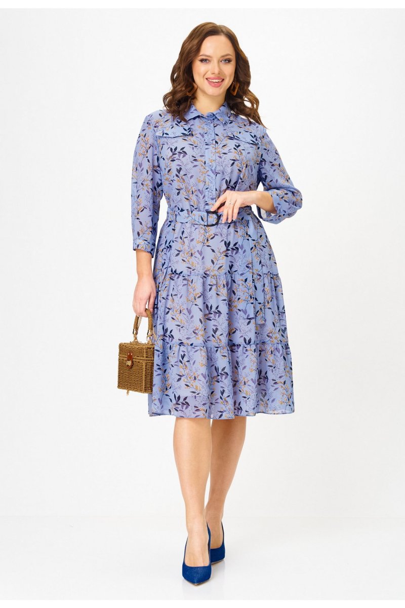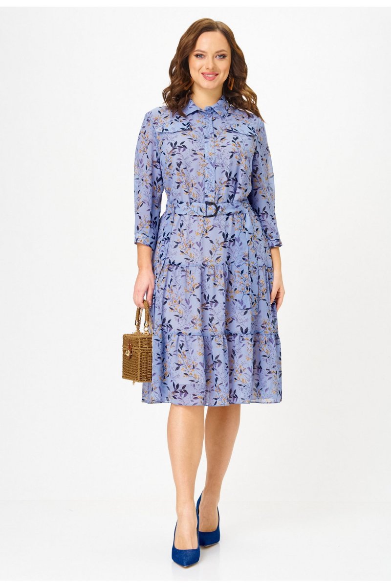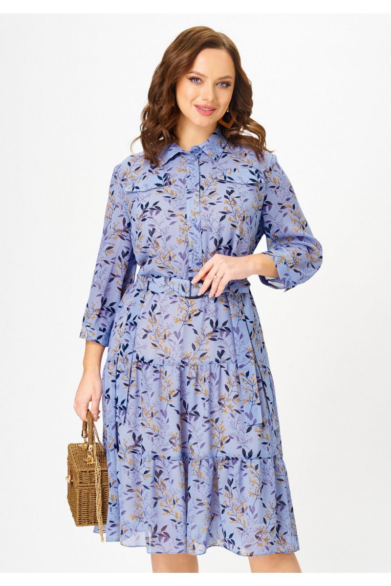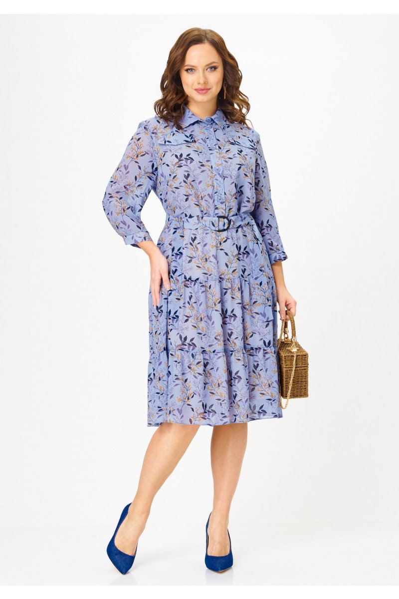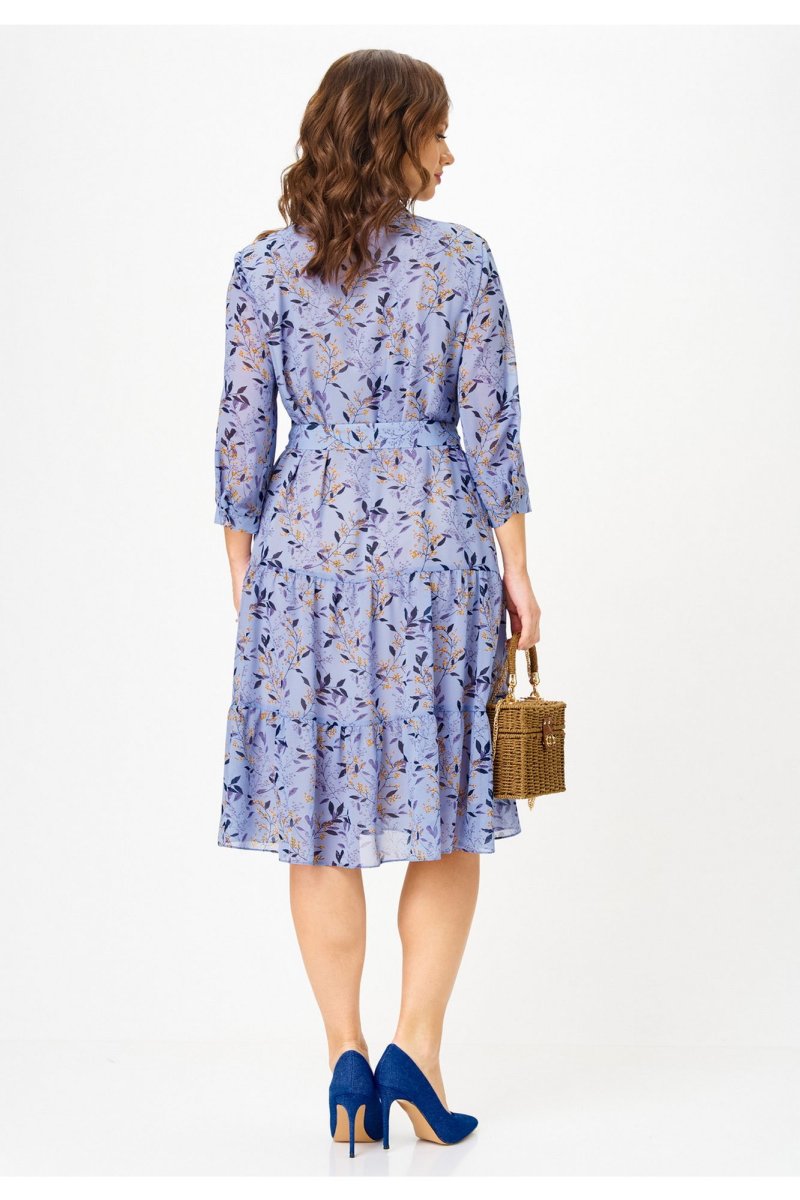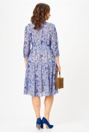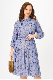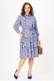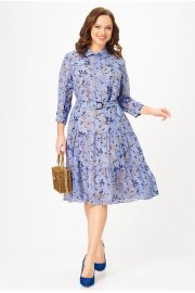 Платье полуприлегающего силуэта, от линии бедер расширенное к низу, выполненное из шифона, на подкладке. В верхней части переда платья - нагрудные выточки, по центру - планка до линии талии, которая застёгивается на петли и пуговицы. В области груди расположены настрочные клапаны. Горловина платья обработана воротником со стойкой рубашечного типа. Нижняя часть платья состоит из воланов. В области талии - шлевки с декоративной тесьмой из основной ткани, спускающейся до середины юбки платья. Рукава короткие с манжетой, застегивающейся на пуговицу. В комплект входит пояс из основной ткани. Шифоновое платье с принтом - идеальный вариант для создания повседневного образа. К нему можно добавить кожаную куртку и яркие аксессуары, например, сумку или шляпу в контрастных тонах. В 48 размере ширина по груди - 53 см, ширина по талии - 51 см, ширина по бедрам - 57 см.