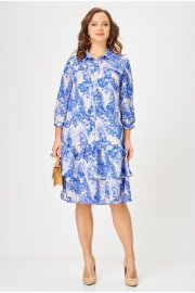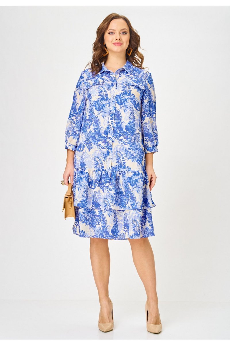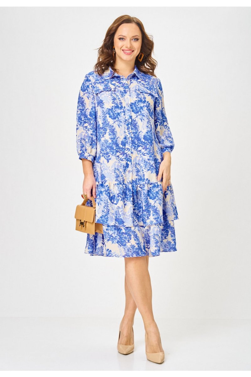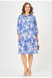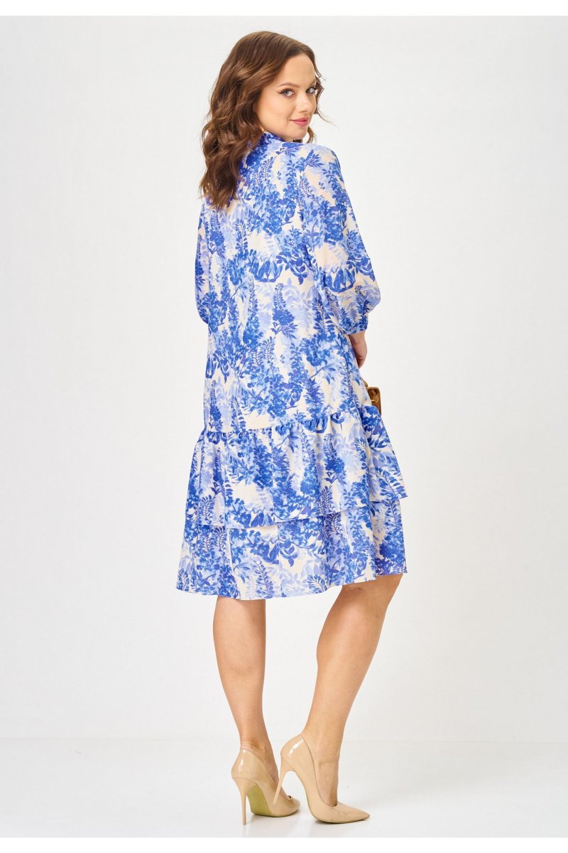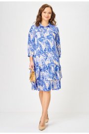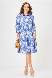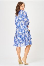 Платье длиной миди свободного кроя, выполненное из шифона на подкладке из вискозы. Горловина платья оформлена воротником рубашечного типа. Перед платья с центральной застёжкой на петли и пуговицы, расположенной до линии бедер. По переду обработаны нагрудные вытачки. В области груди - настрочные декоративные клапаны, с рюшами. Нижняя часть платья состоит из двух воланов. В боковых швах обработаны карманы. Рукав втачной одношовный, длиной 3/4, низ рукава на притачной манжете, которая застёгивается на петлю пуговицу. Верхняя часть спинки цельнокроеная, нижняя, как и перед платья, состоит из 2-х воланов. Универсальное платье на все случаи жизни.