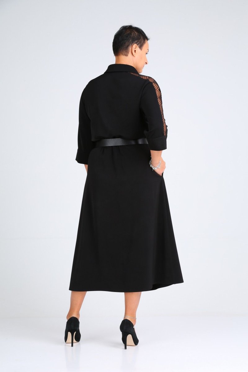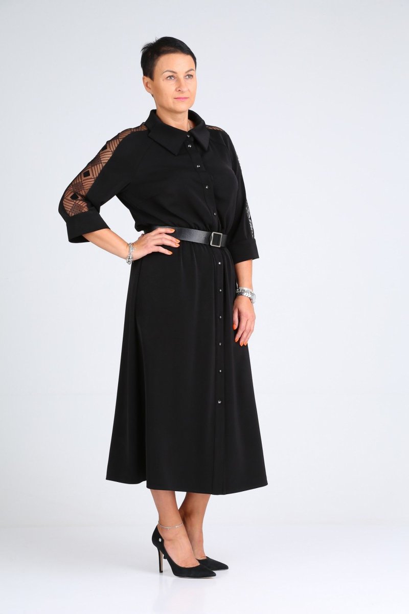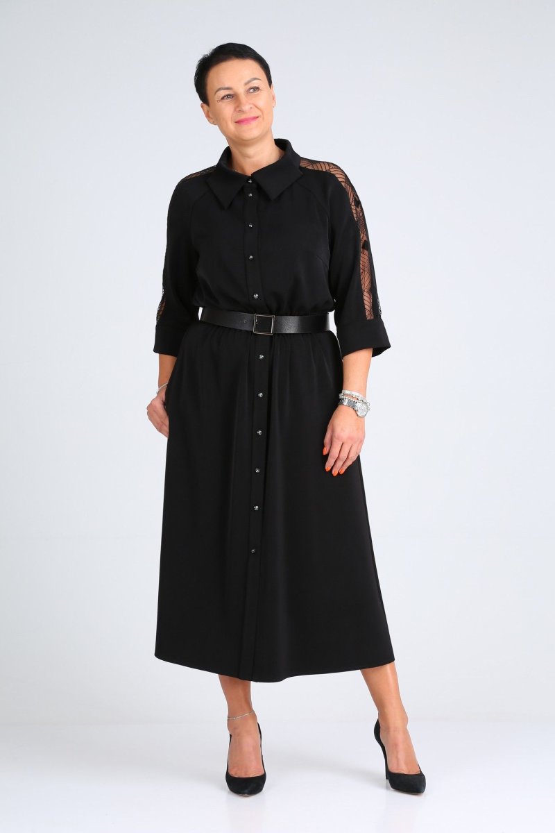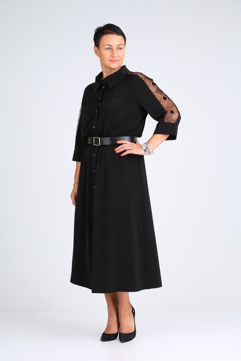 Платье полуприлегающего силуэта из костюмной ткани, отрезное по линии талии с юбкой трапециевидной формы. Длина платья по спинке 125 см. Застежка на петли и пуговицы. В боковых швах обработаны карманы.