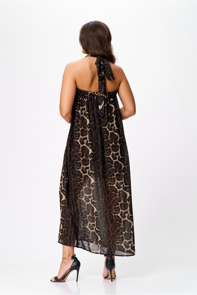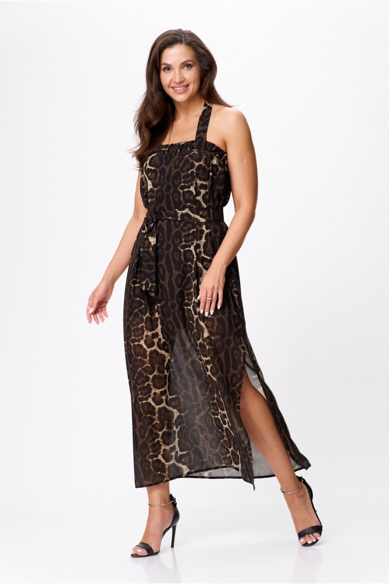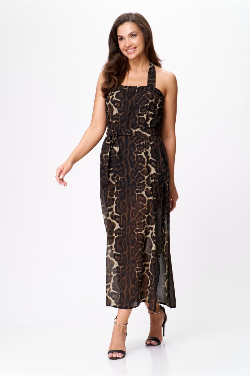 Верхняя часть изделия выполнена на широкой резинке, в боковом шве выполнен высокий разрез. Широкие бретели, завязывающиеся вокруг шеи на бант, придают спинке особую пикантность. Этот сарафан отлично сочетается как с нарядной обувью, так и с кроссовками, и сандалиями. Добавив к нему пояс из основной ткани, Вы подчеркнете талию и создадите неповторимый шикарный летний образ для запоминающихся моментов.