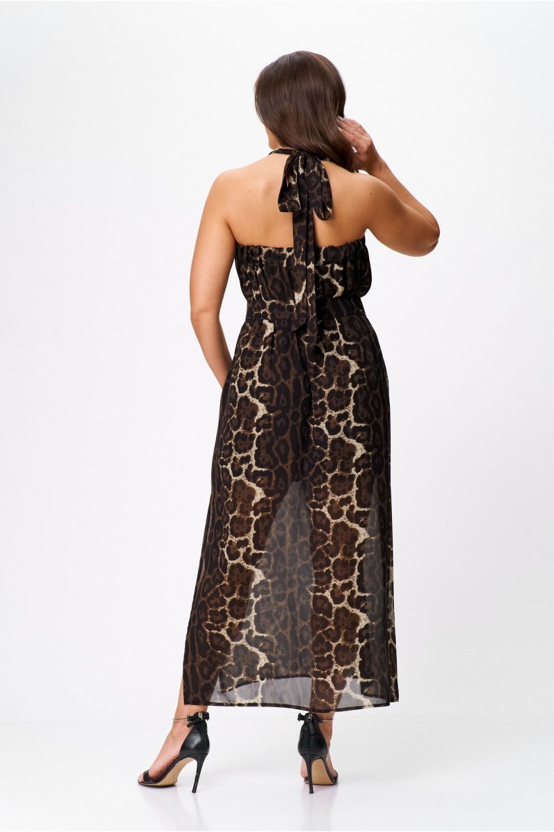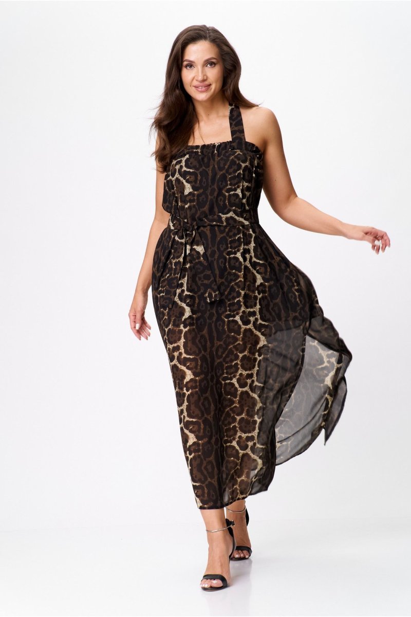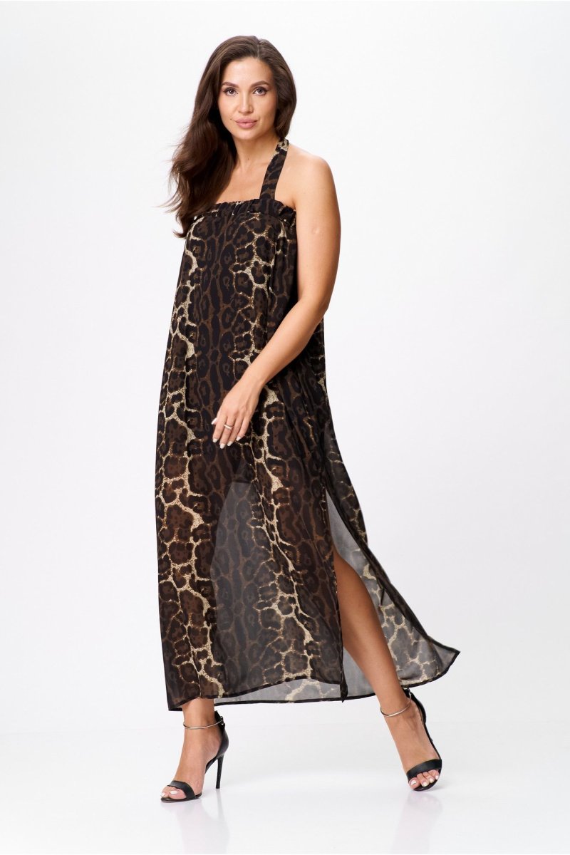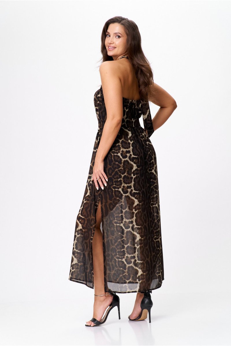 Верхняя часть изделия выполнена на широкой резинке, в боковом шве выполнен высокий разрез. Широкие бретели, завязывающиеся вокруг шеи на бант, придают спинке особую пикантность. Этот сарафан отлично сочетается как с нарядной обувью, так и с кроссовками, и сандалиями. Добавив к нему пояс из основной ткани, Вы подчеркнете талию и создадите неповторимый шикарный летний образ для запоминающихся моментов.