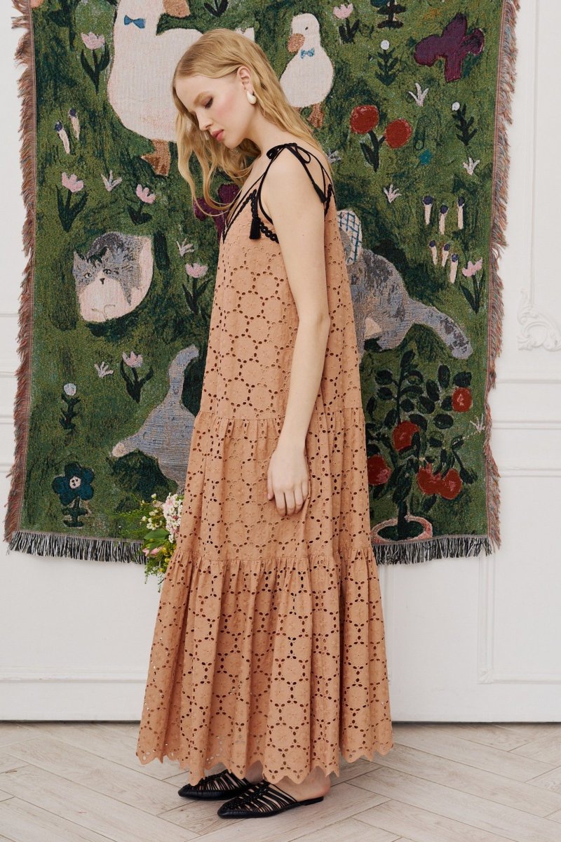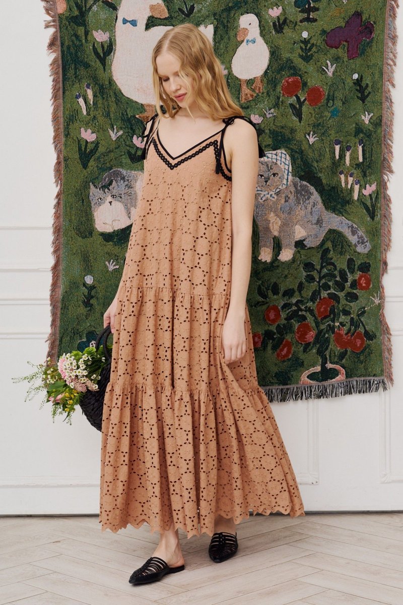 Платье-сарафан свободного кроя из хлопковой ткани ришелье. Хлопковая подкладка до нижнего подреза, по плечам бретели на завязку. По переду и спинке фигурный вырез горловины, обработанный кружевной тесьмой, которая плавно переходит в боковой шов. К лифу пришиты воланы на сборку. Между нижними воланами вшита кружевная тесьма.