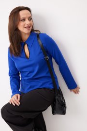 Горловина обработана воротником и имеет вырез в виде капли с застёжкой на пуговицу, который визуально удлиняет шею и рисует красивое декольте. Передняя часть с нагрудными вытачками. Рукав втачной, полной длины, низ которого обработан вподгибку.