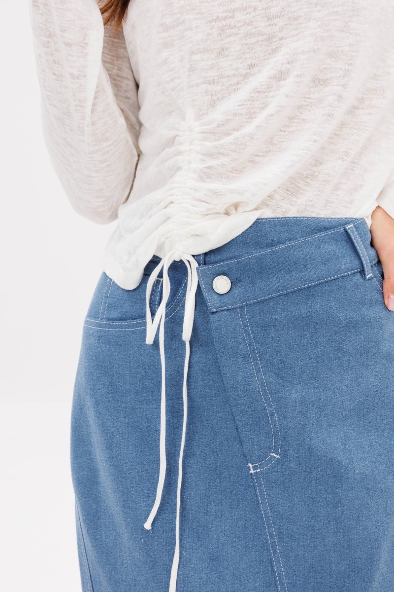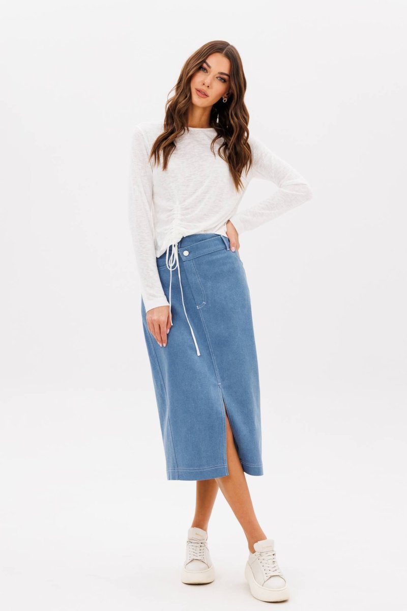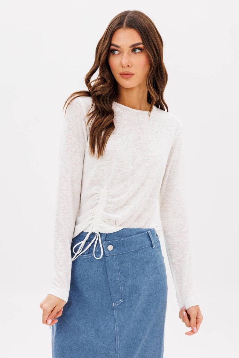 Полуприлегающий силуэт, втачной покрой, круглая горловина, длинный зауженный рукав. По низу джемпера с одной стороны декоративная сборка.