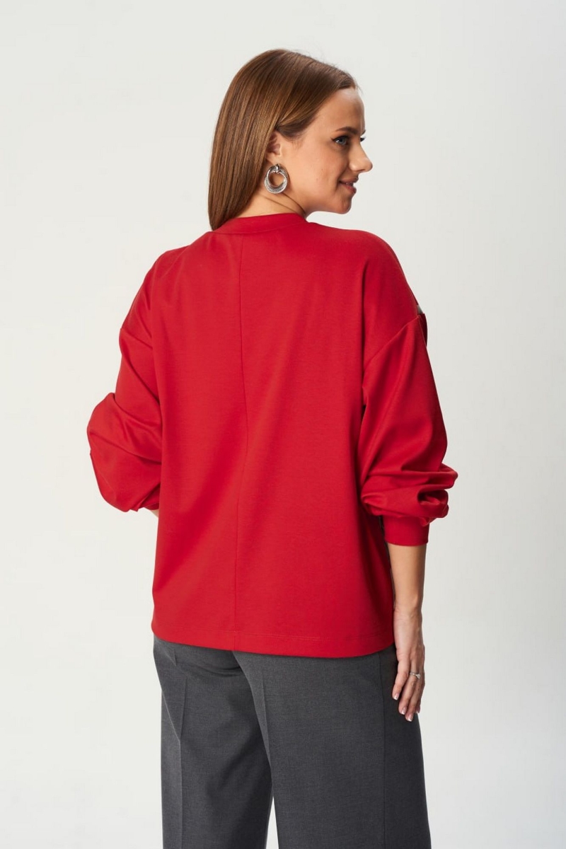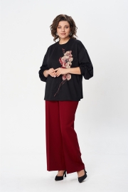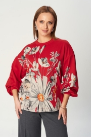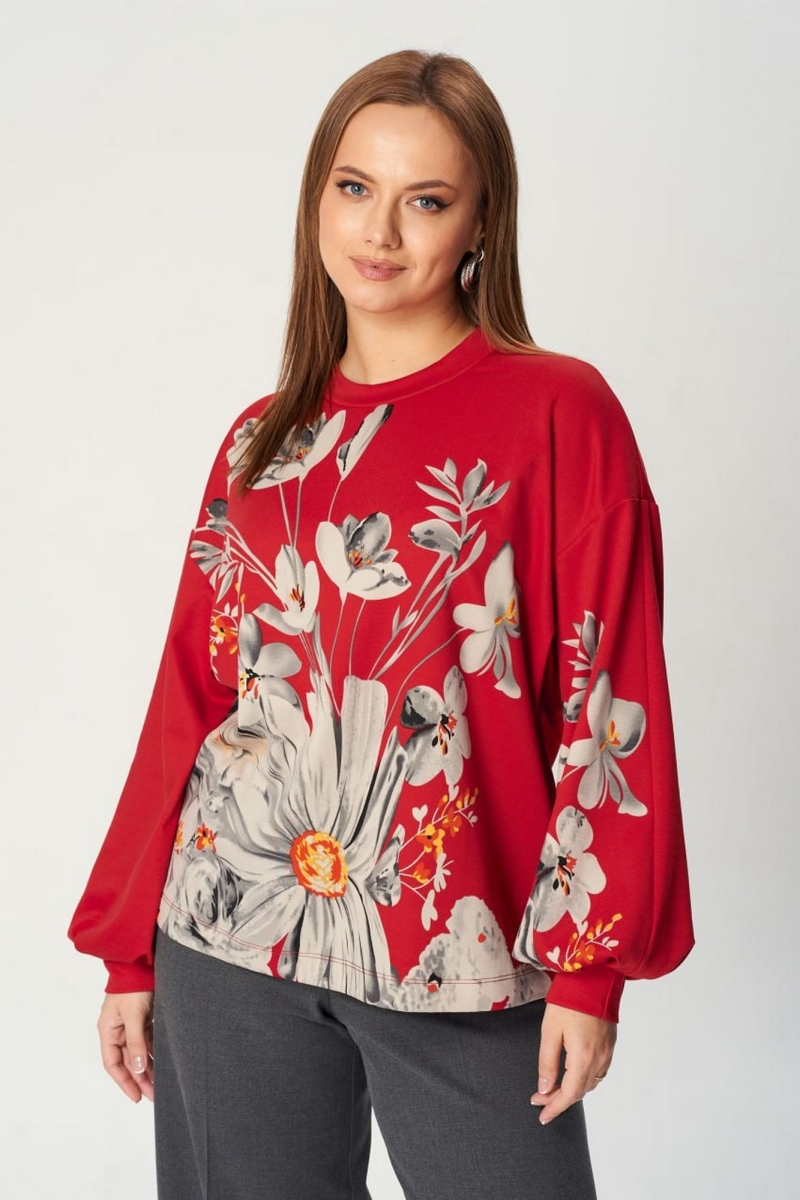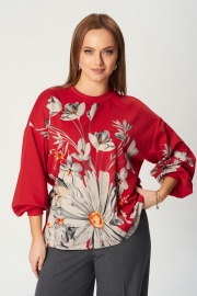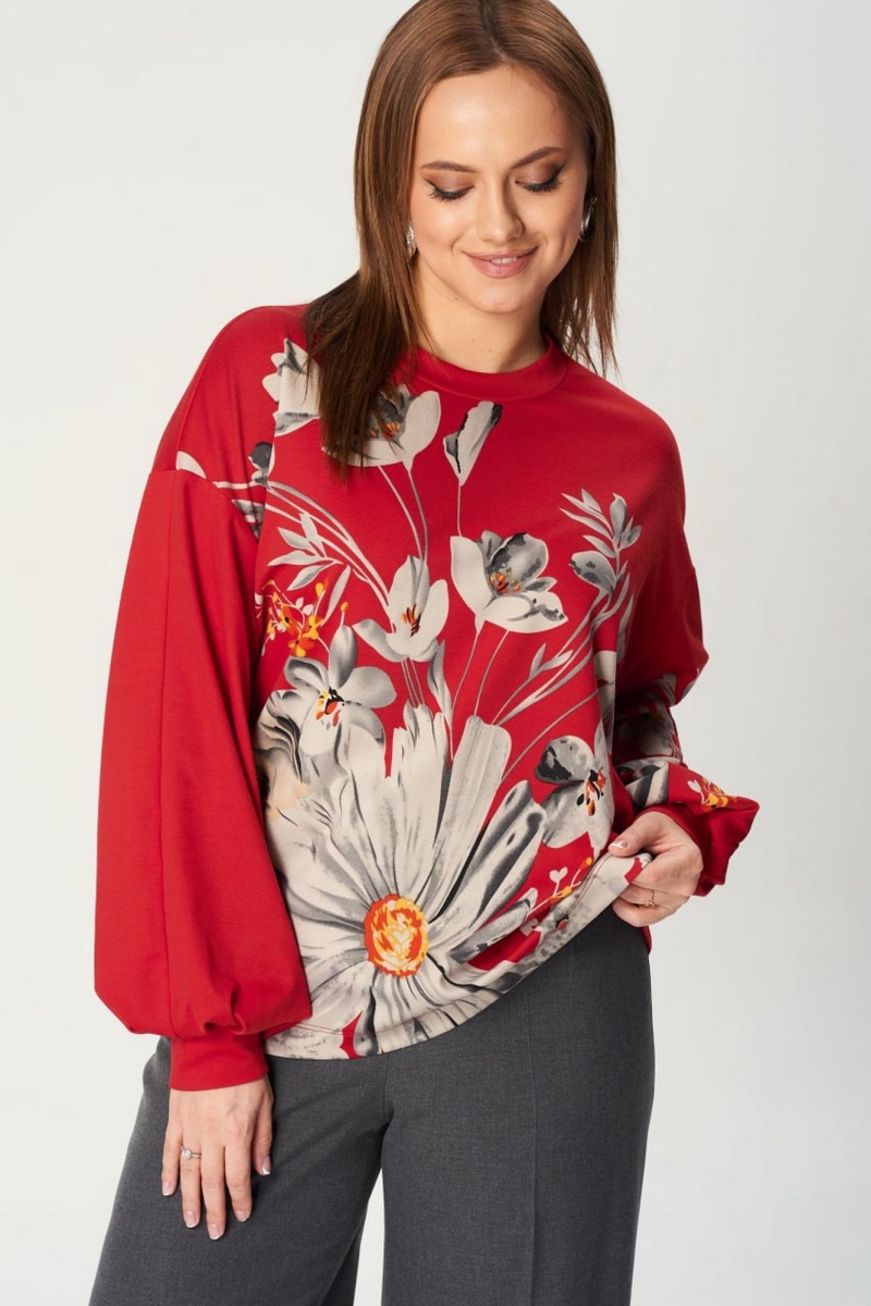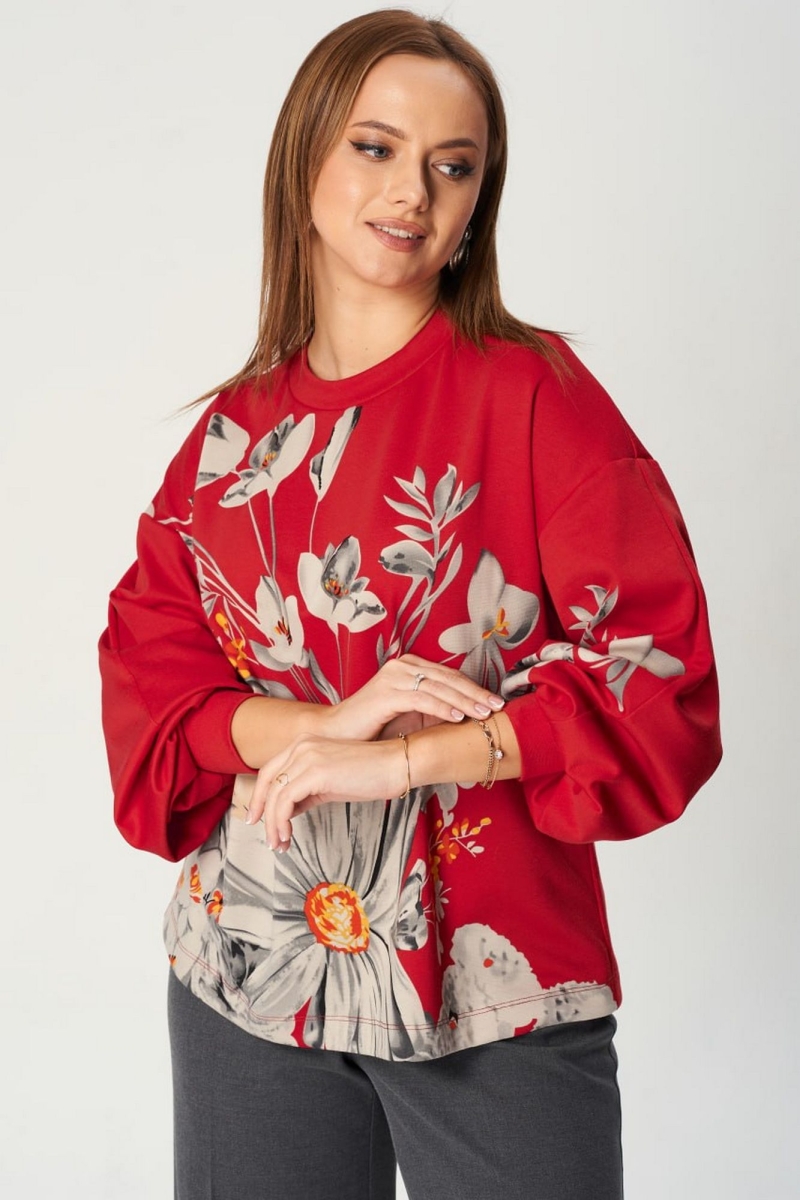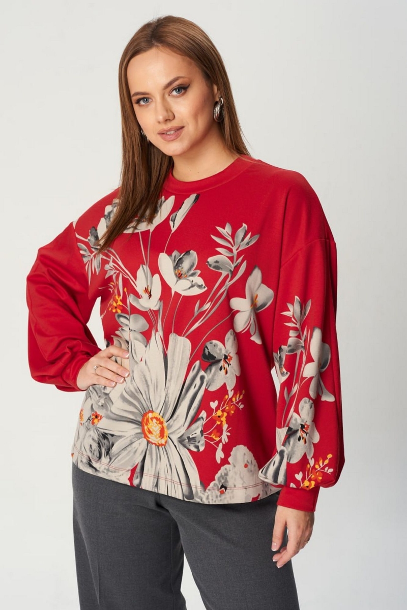Джемпер свободного силуэта из трикотажной ткани с принтом. Рукав втачной двухшовный со складками по низу и манжетой. Спинка со средним швом. Горловина обработана планкой. Длина джемпера - 66 см, длина рукава джемпера - 53 см.