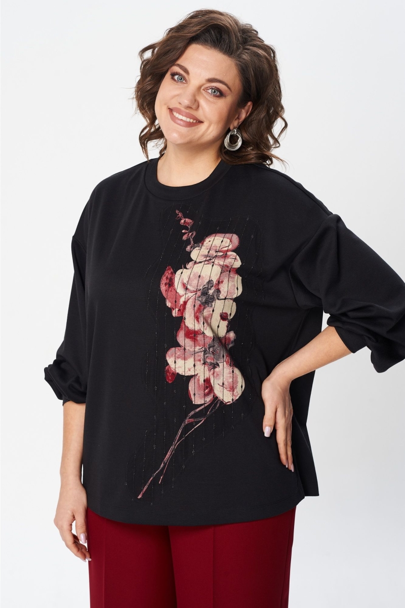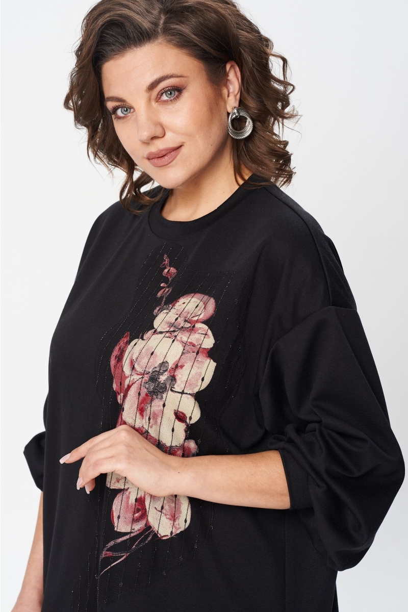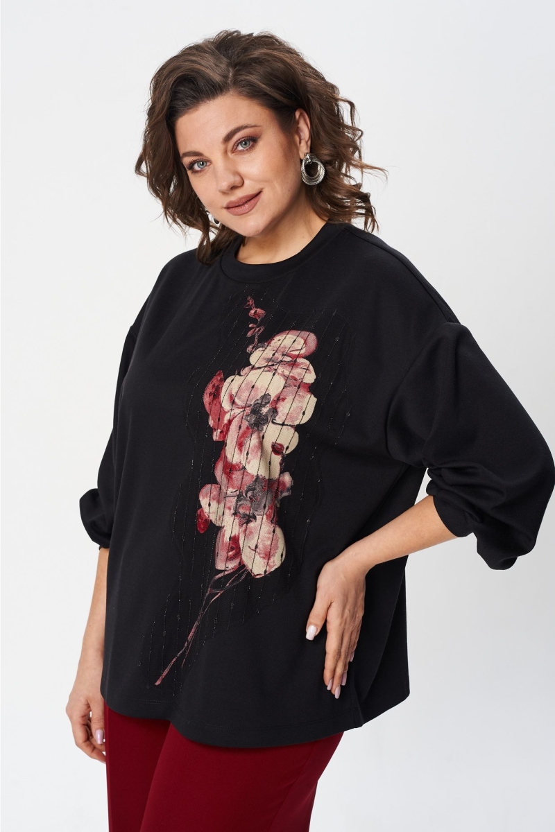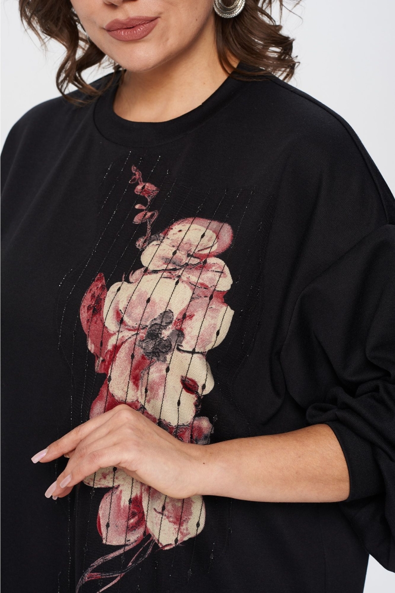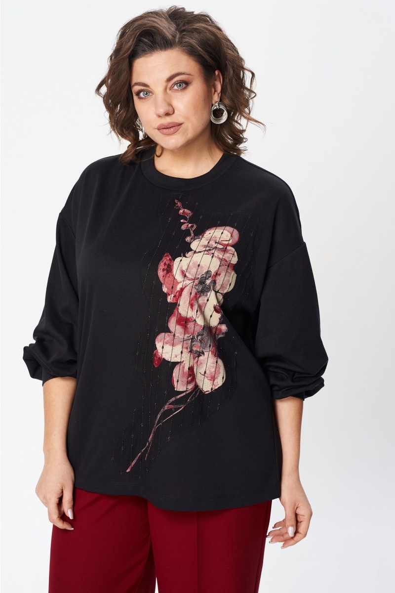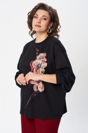 Джемпер свободного силуэта из трикотажной ткани с принтом. Рукав втачной одношовный со складками по низу и манжетой. Горловина обработана планкой. По переду поверх принта настрочена сетка с рисунком. Длина джемпера - 66 см, длина рукава джемпера - 53 см. Джемпер отлично комплектуется с брюками из каталога GIZART под артикулом 35204.