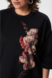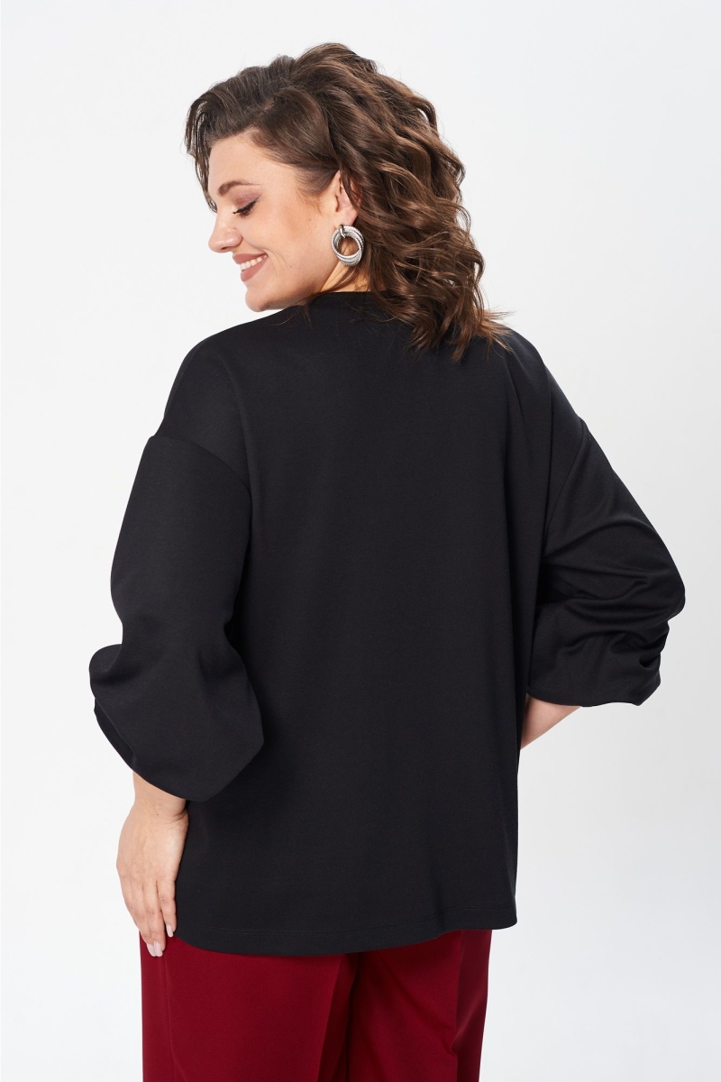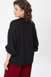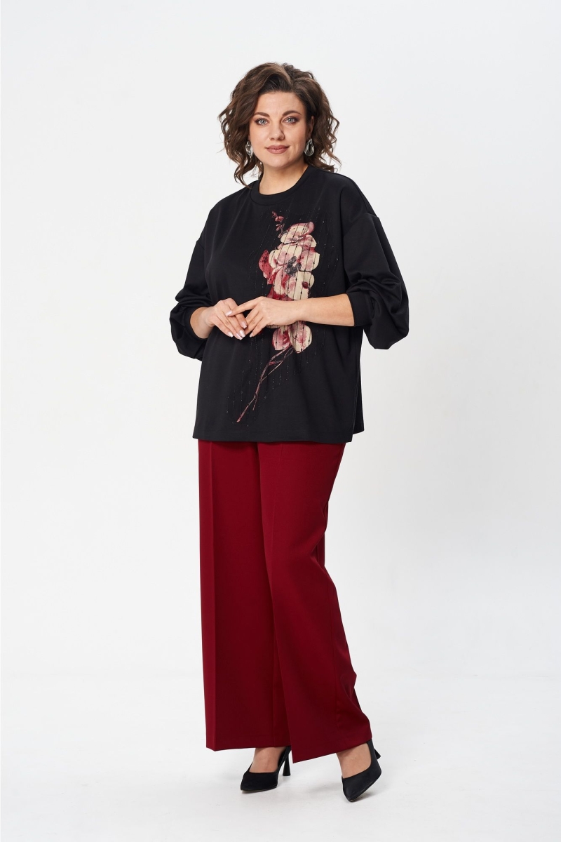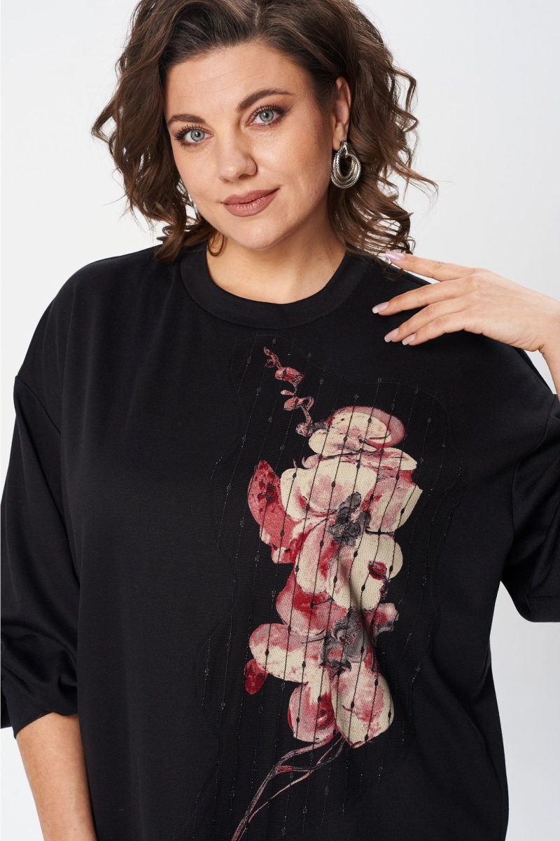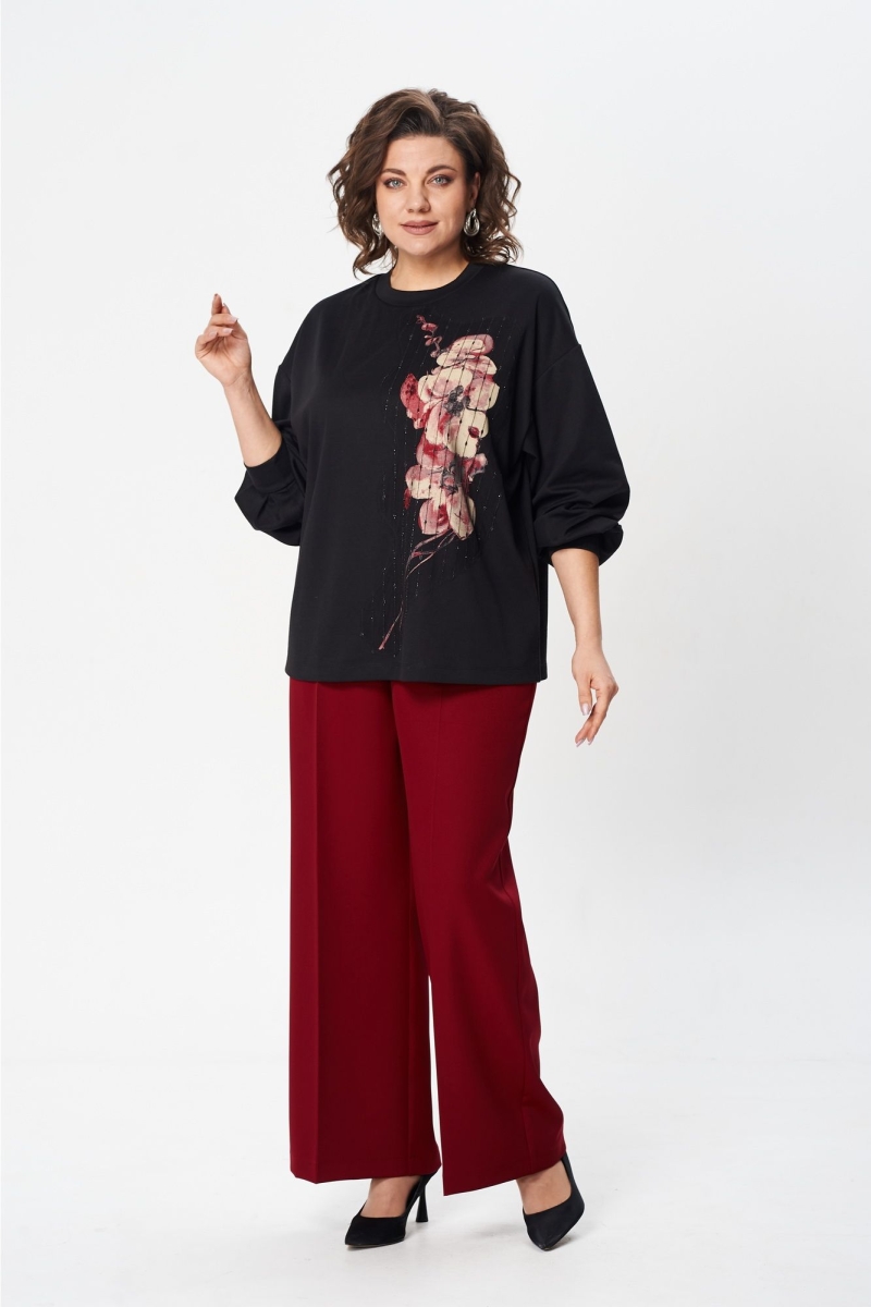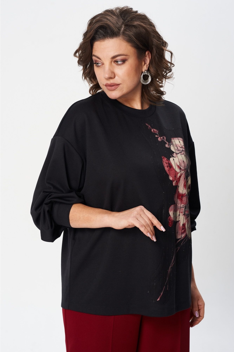 Джемпер свободного силуэта из трикотажной ткани с принтом. Рукав втачной одношовный со складками по низу и манжетой. Горловина обработана планкой. По переду поверх принта настрочена сетка с рисунком. Длина джемпера - 66 см, длина рукава джемпера - 53 см. Джемпер отлично комплектуется с брюками из каталога GIZART под артикулом 35204.