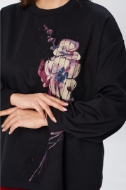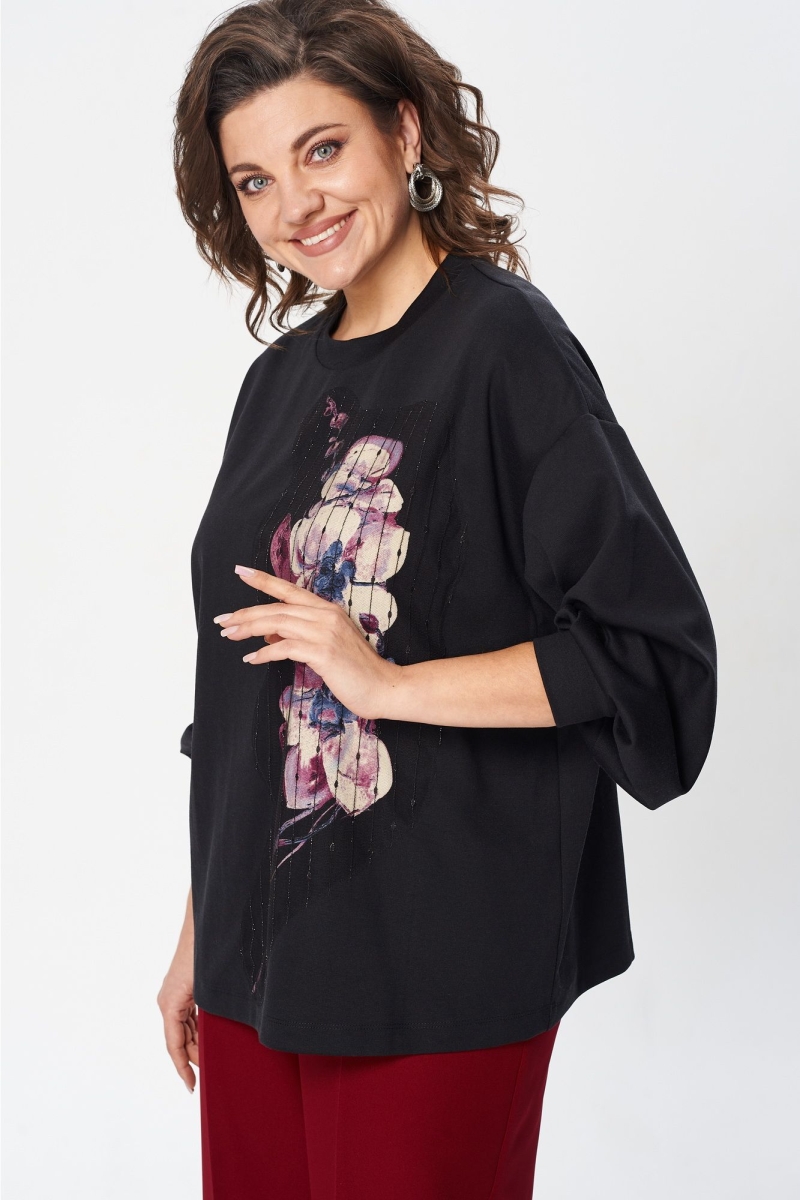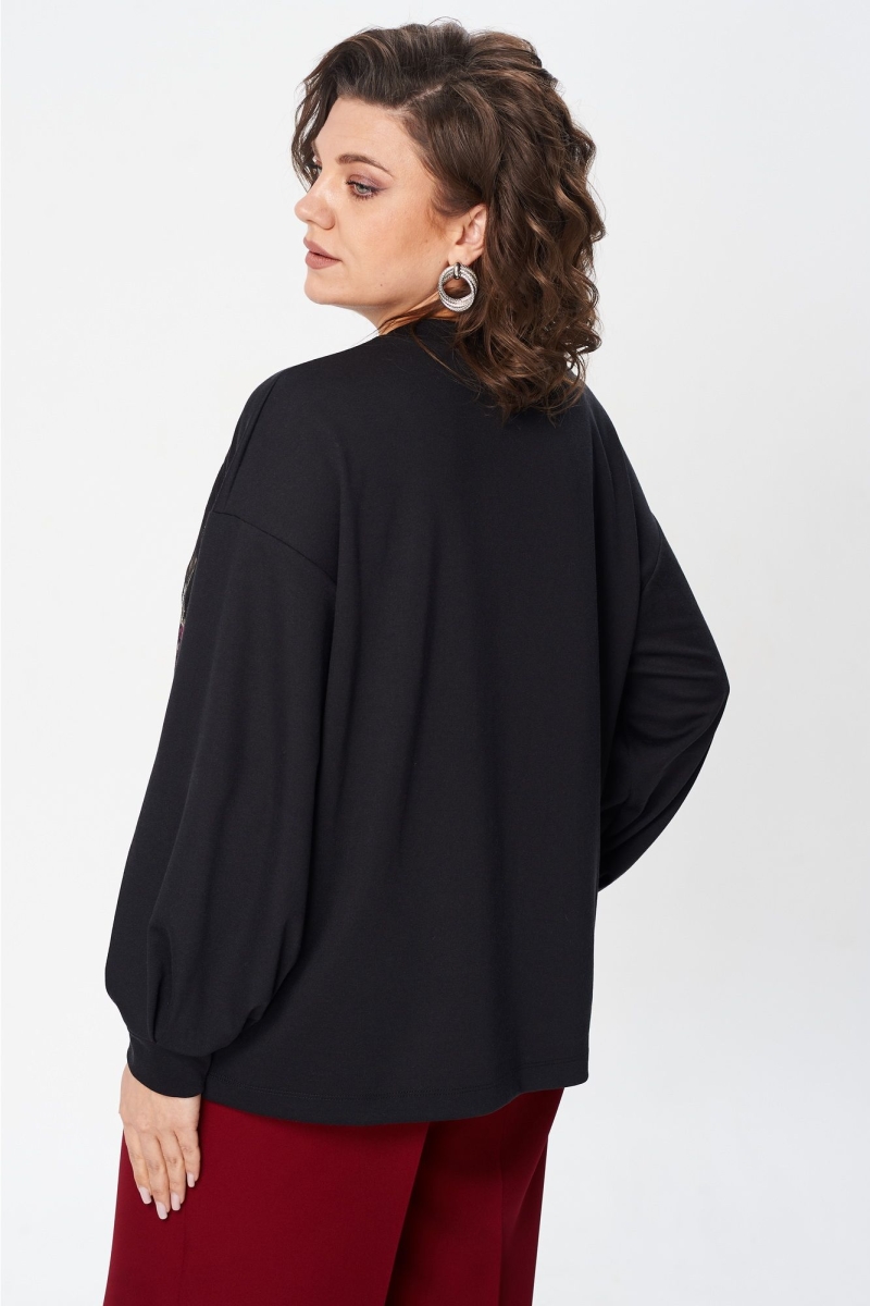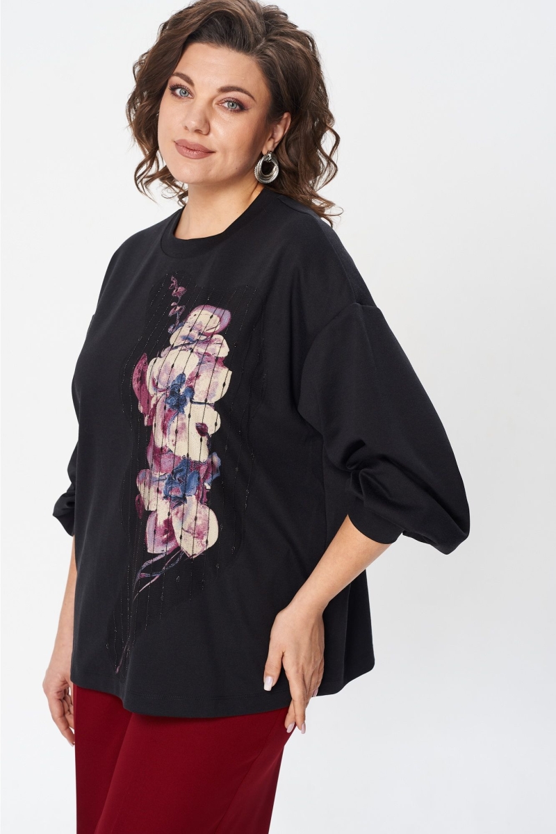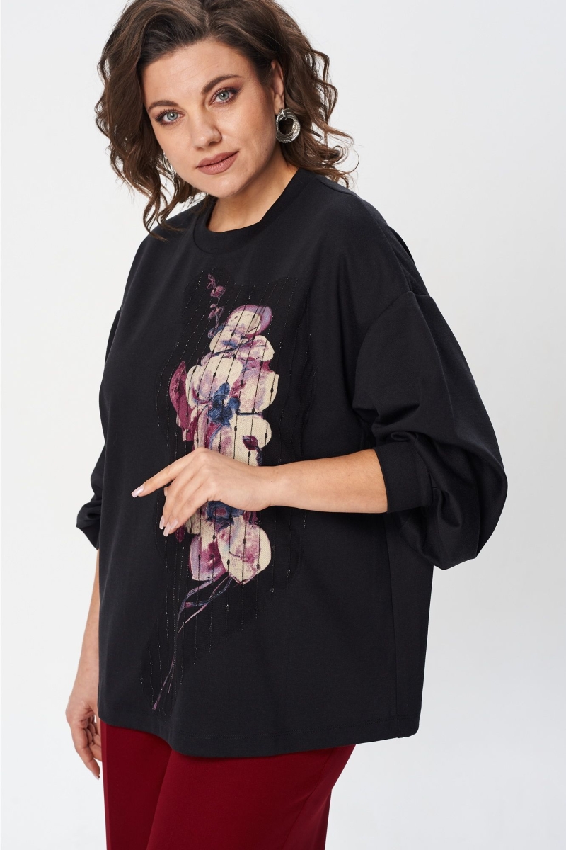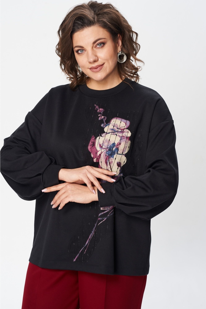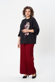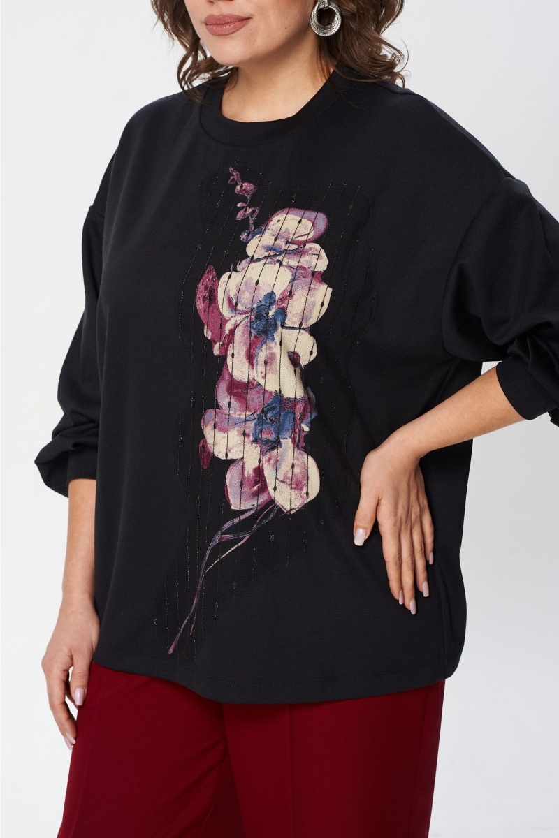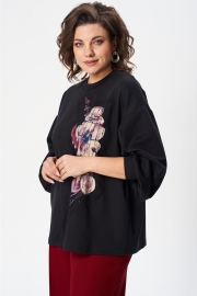 Джемпер свободного силуэта из трикотажной ткани с принтом. Рукав втачной одношовный со складками по низу и манжетой. Горловина обработана планкой. По переду поверх принта настрочена сетка с рисунком. Длина джемпера - 66 см, длина рукава джемпера - 53 см. Джемпер отлично комплектуется с брюками из каталога GIZART под артикулом 35204.