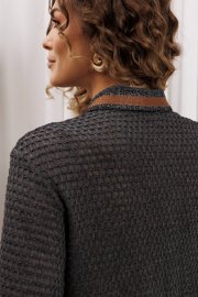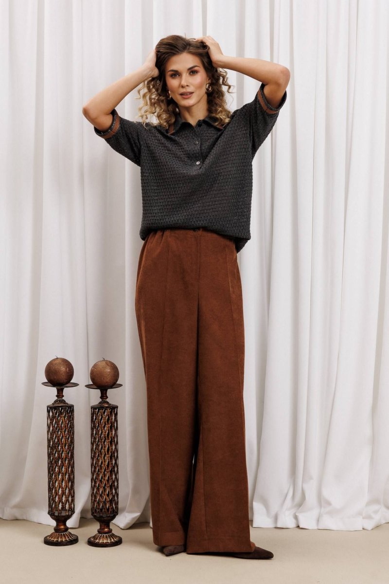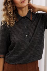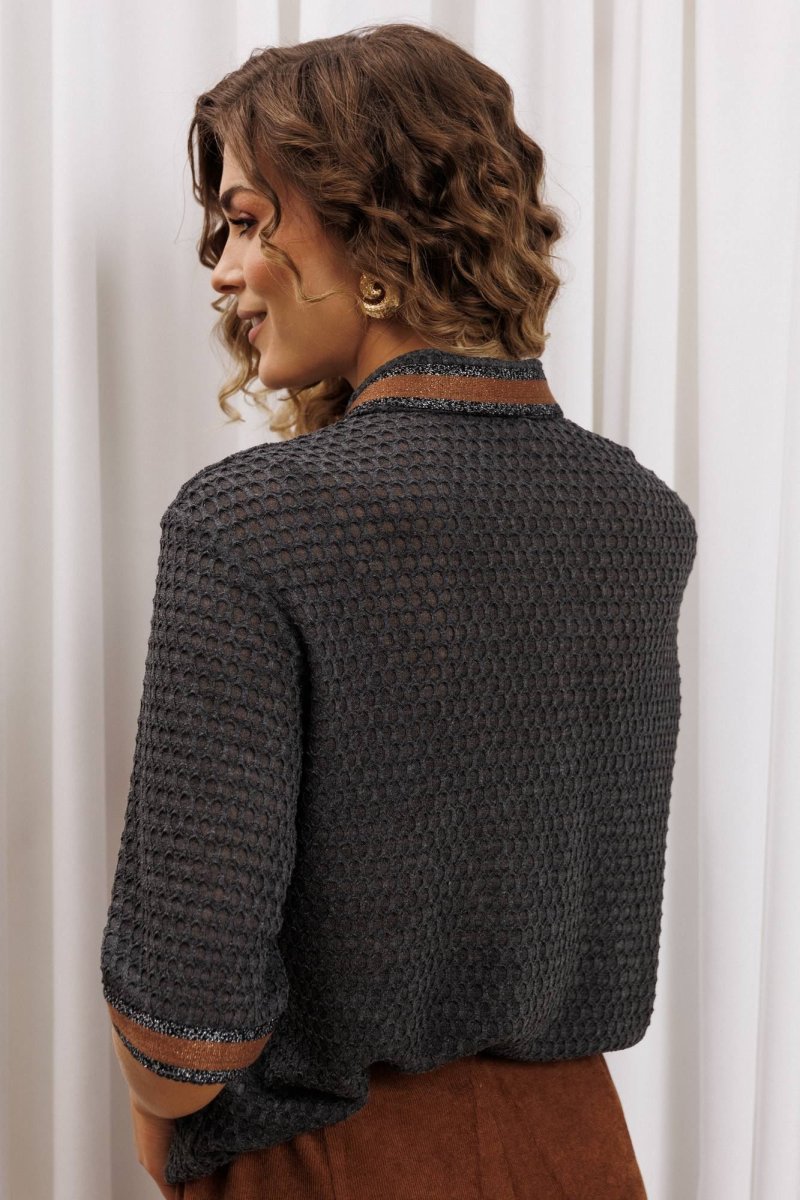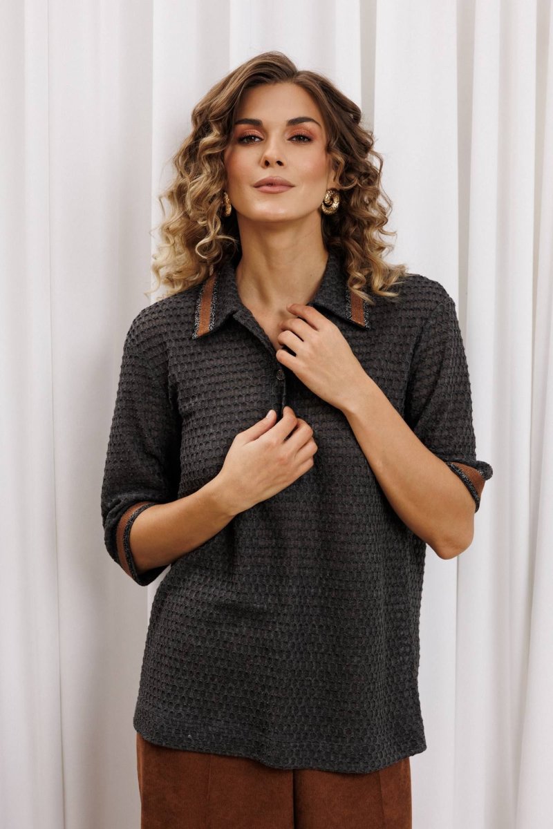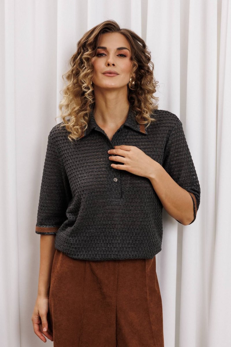 Джемпер прямого силуэта из трикотажного трикотажного ажурного полотна. Перед с застежкой поло и нагрудными вытачками. По воротнику и низу рукава настрочена декоративная тесьма. Длина джемпера - 69 см, длина рукава - 32 см.