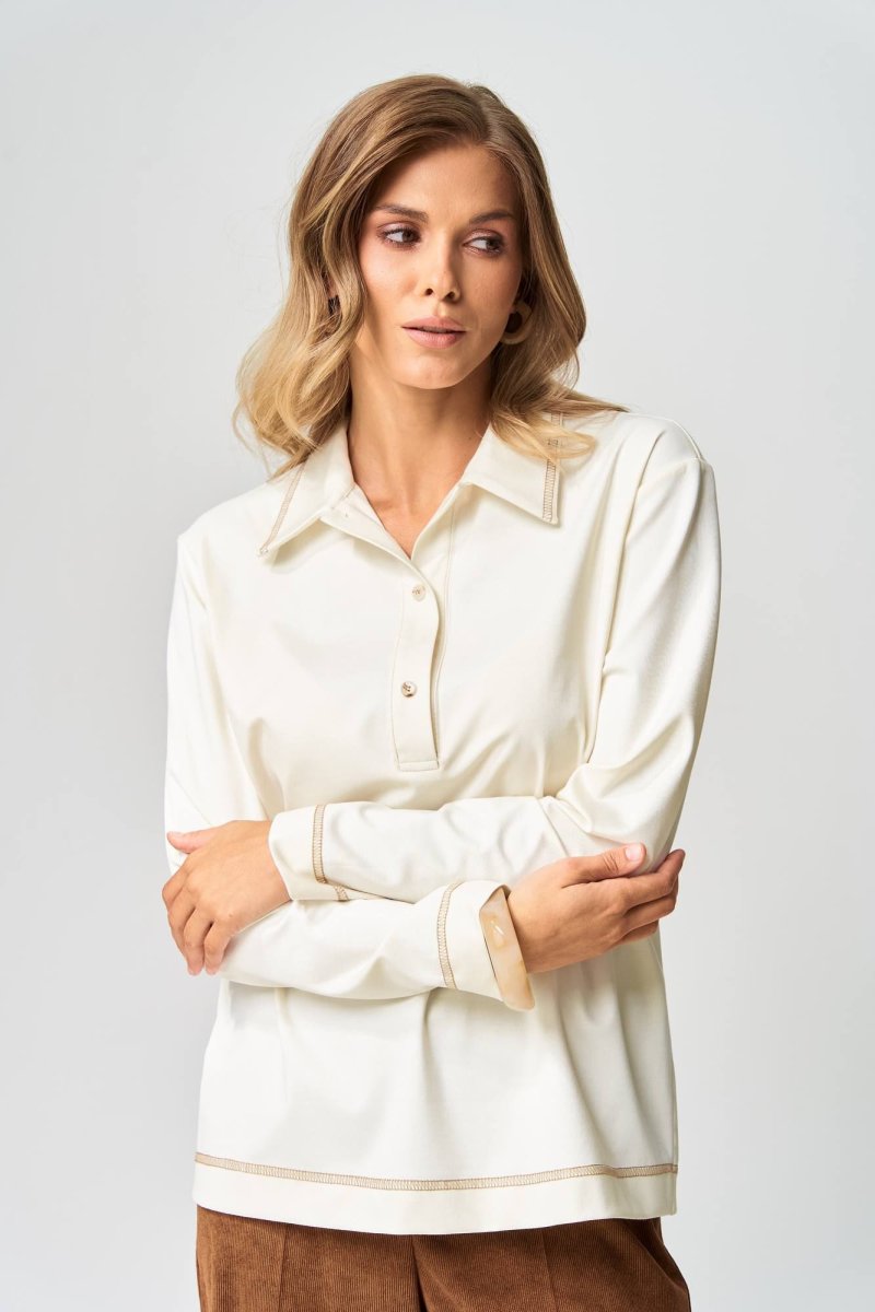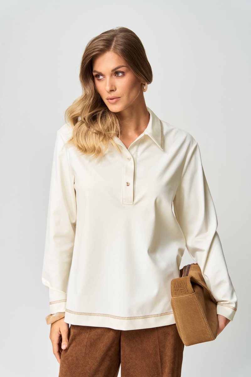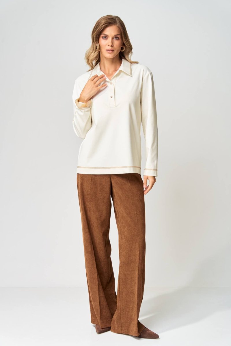 Джемпер прямого силуэта с воротником поло из плотной хлопковой ткани "двухнитка". Рукав втачной одношовный. По низу изделия, по низу рукава и по воротнику проложена отделочная строчка. Длина джемпера- 66 см, длина рукава - 60 см. Данная модель прекрасно сочетается с другими моделями из нашей коллекции 35204, 15408/1, 15408, 35377. Создайте гармоничный образ, комбинируя эти изделия!