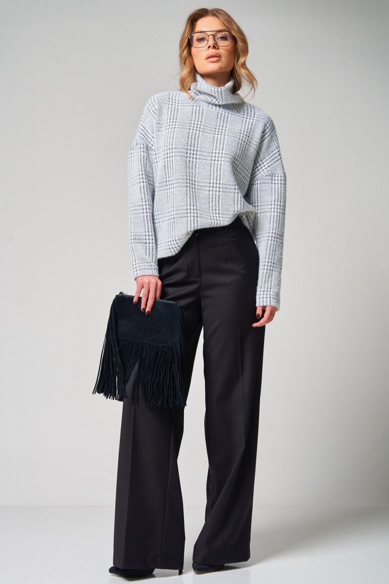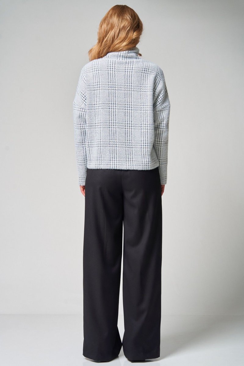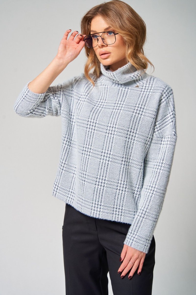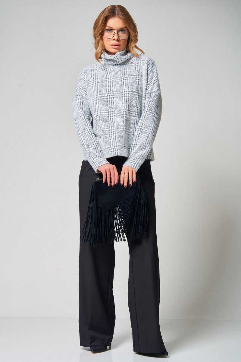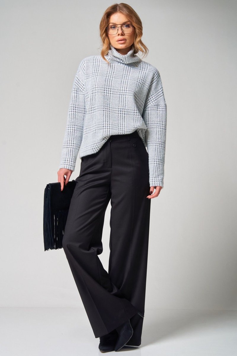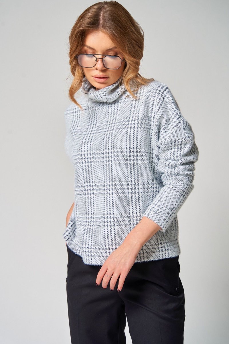 Воротник-стойка с отворотом, по горловине слева прикреплено декоративное украшение. Джемпер со спущенной линией плеча, рукава втачные одношовные.