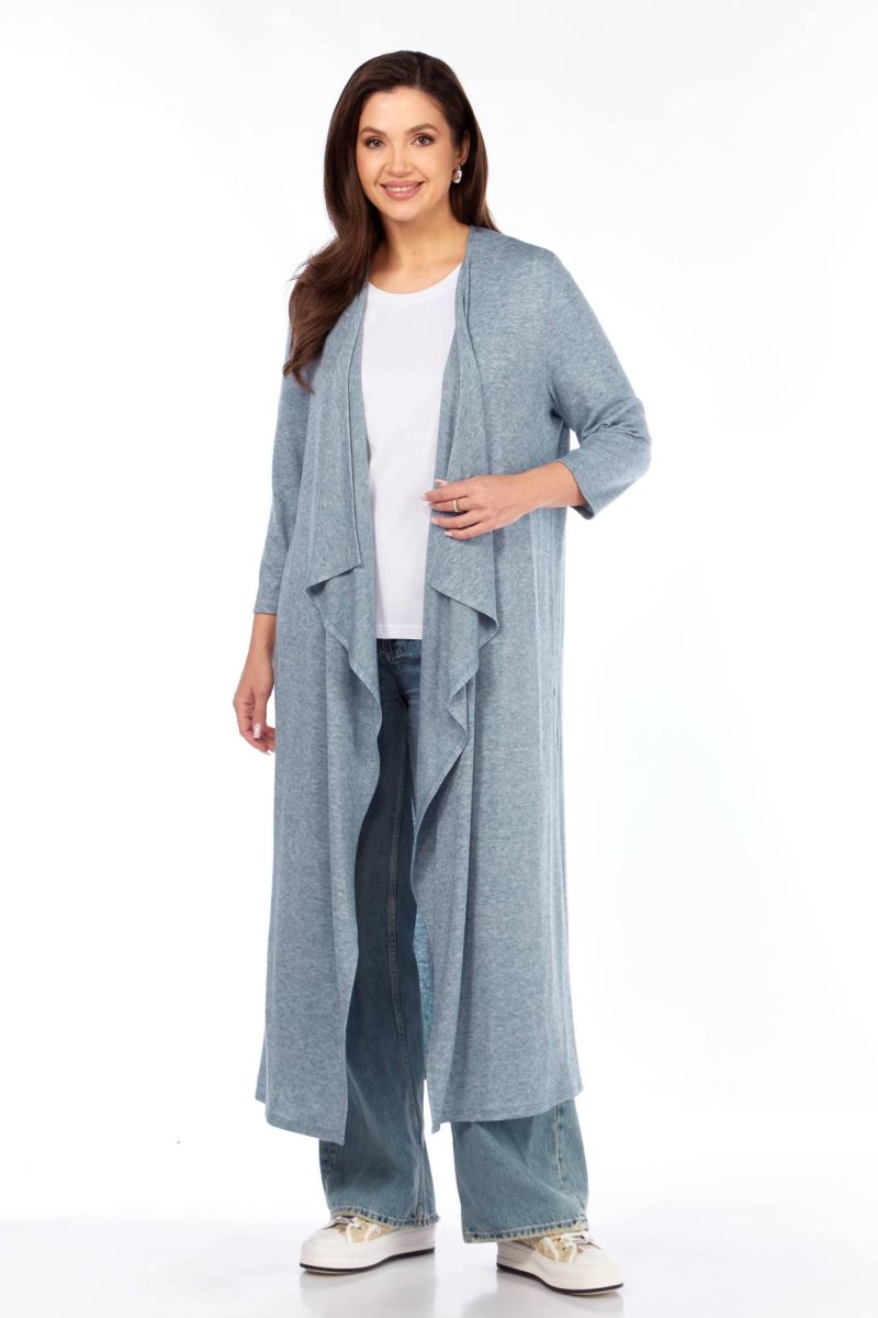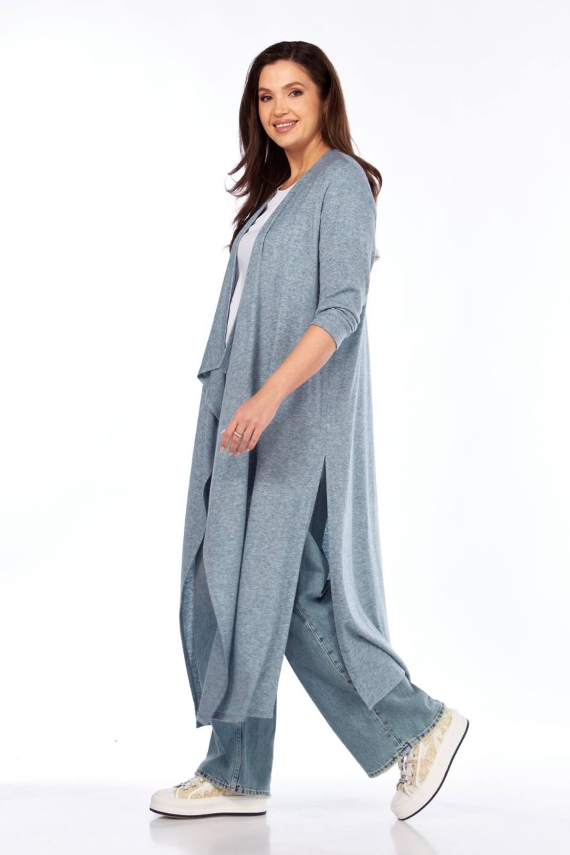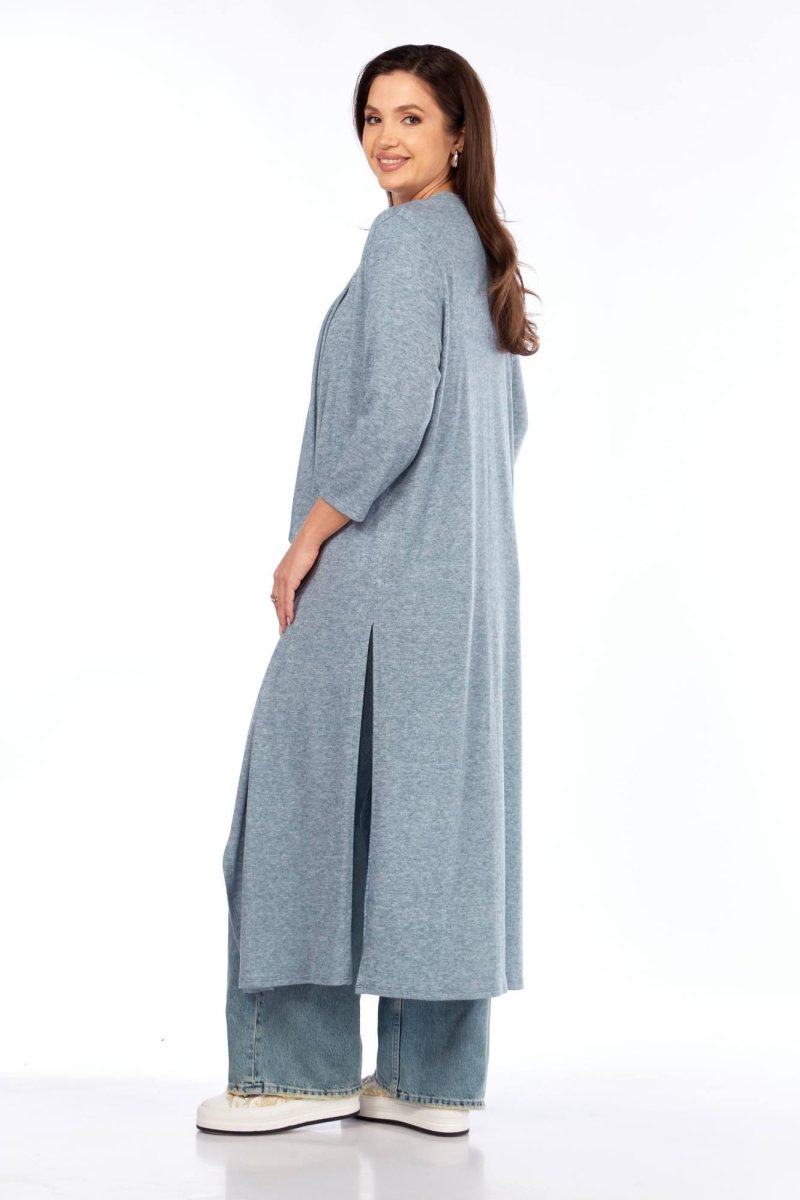 Кардиган женский из трикотажного полотна, удлинённый, свободного силуэта, без застёжки, с втачным рукавом 3/4 длины, без воротника, с боковыми разрезами и драпировкой по переду.