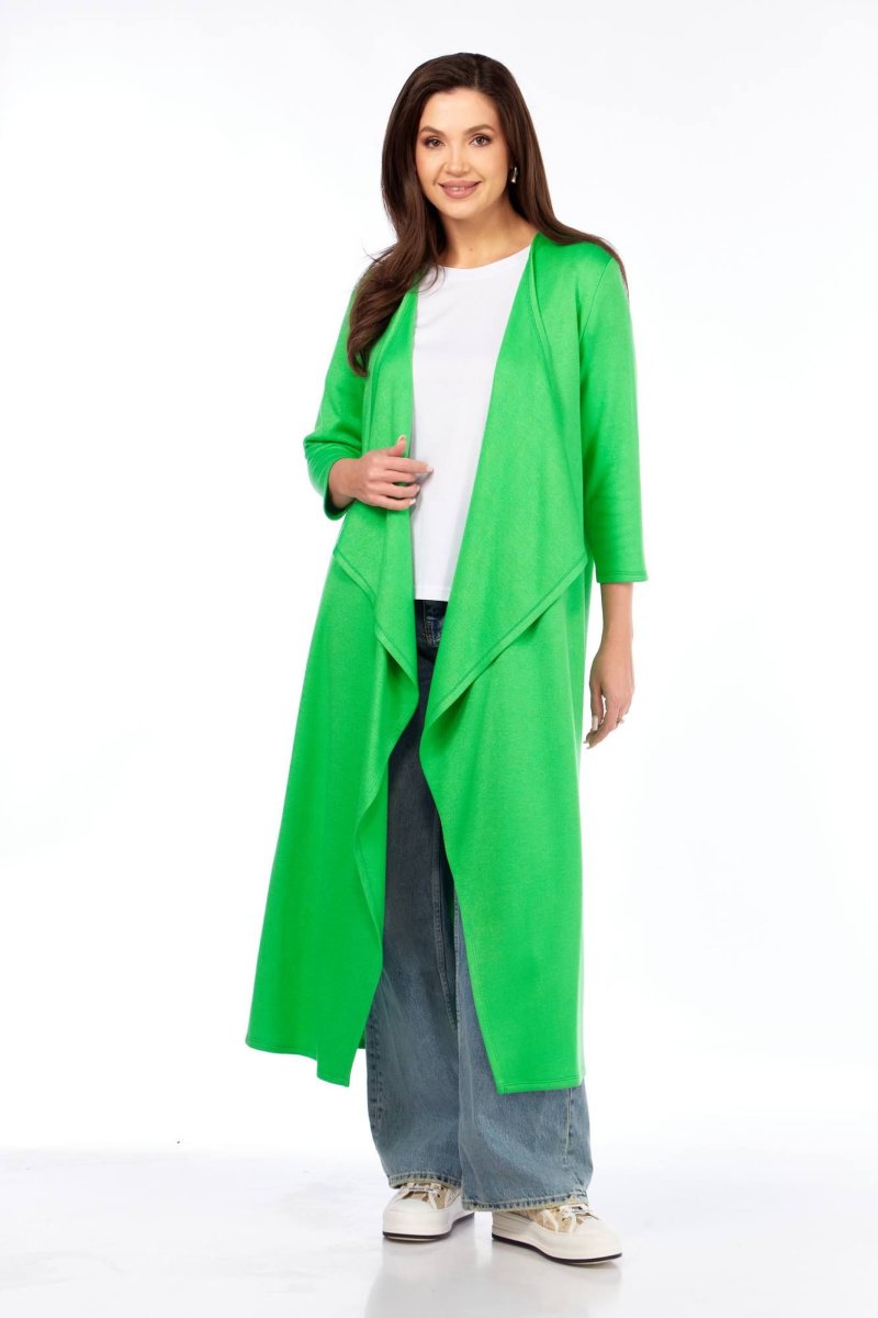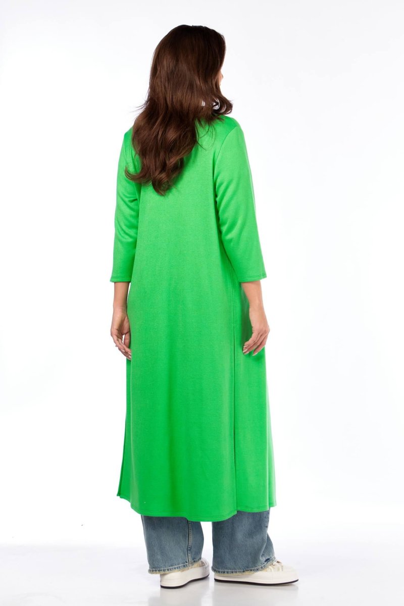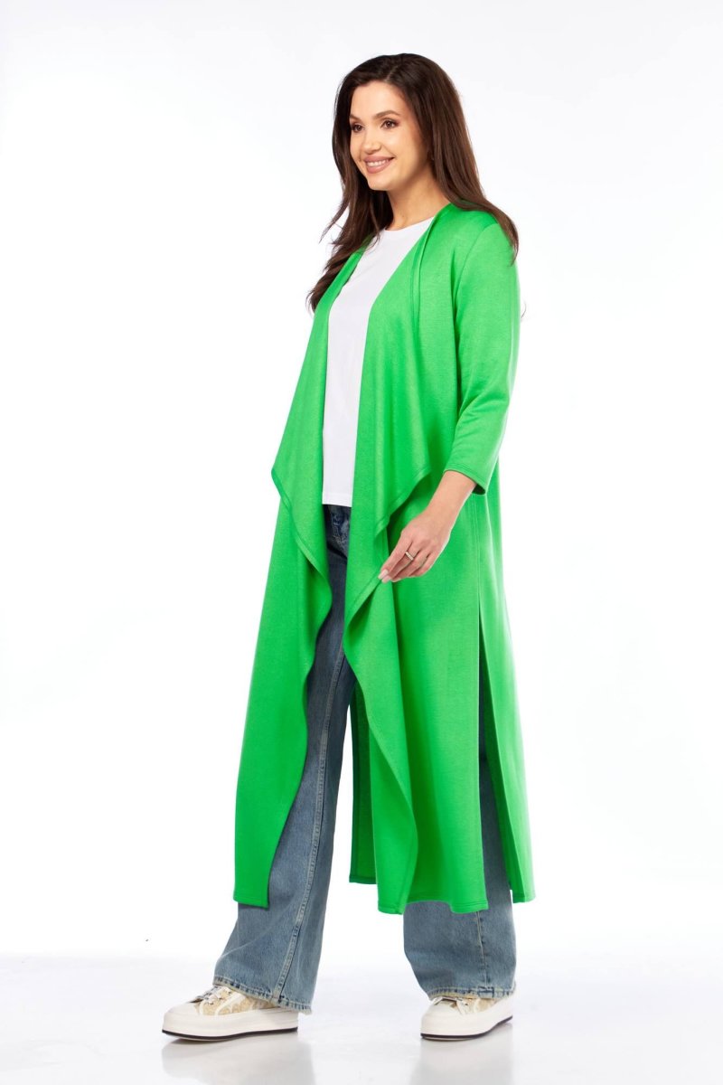 Кардиган женский из трикотажного полотна, удлинённый, свободного силуэта, без застёжки, с втачным рукавом 3/4 длины, без воротника, с боковыми разрезами и драпировкой по переду.
