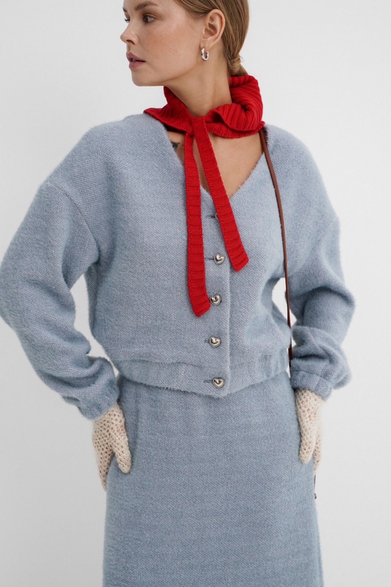 Пушистый укороченный бомбер с декоративными пуговицами. Детали: спущенная линия плеча, V-образный вырез горловины переда, застежка на петли и пуговицы, рукава и низ на резинке, подкладка. Длина по спинке около 47 см в размерах 40-46 и около 50 см в размерах 48-52, длина рукава со спущенным плечом около 47+13 см.