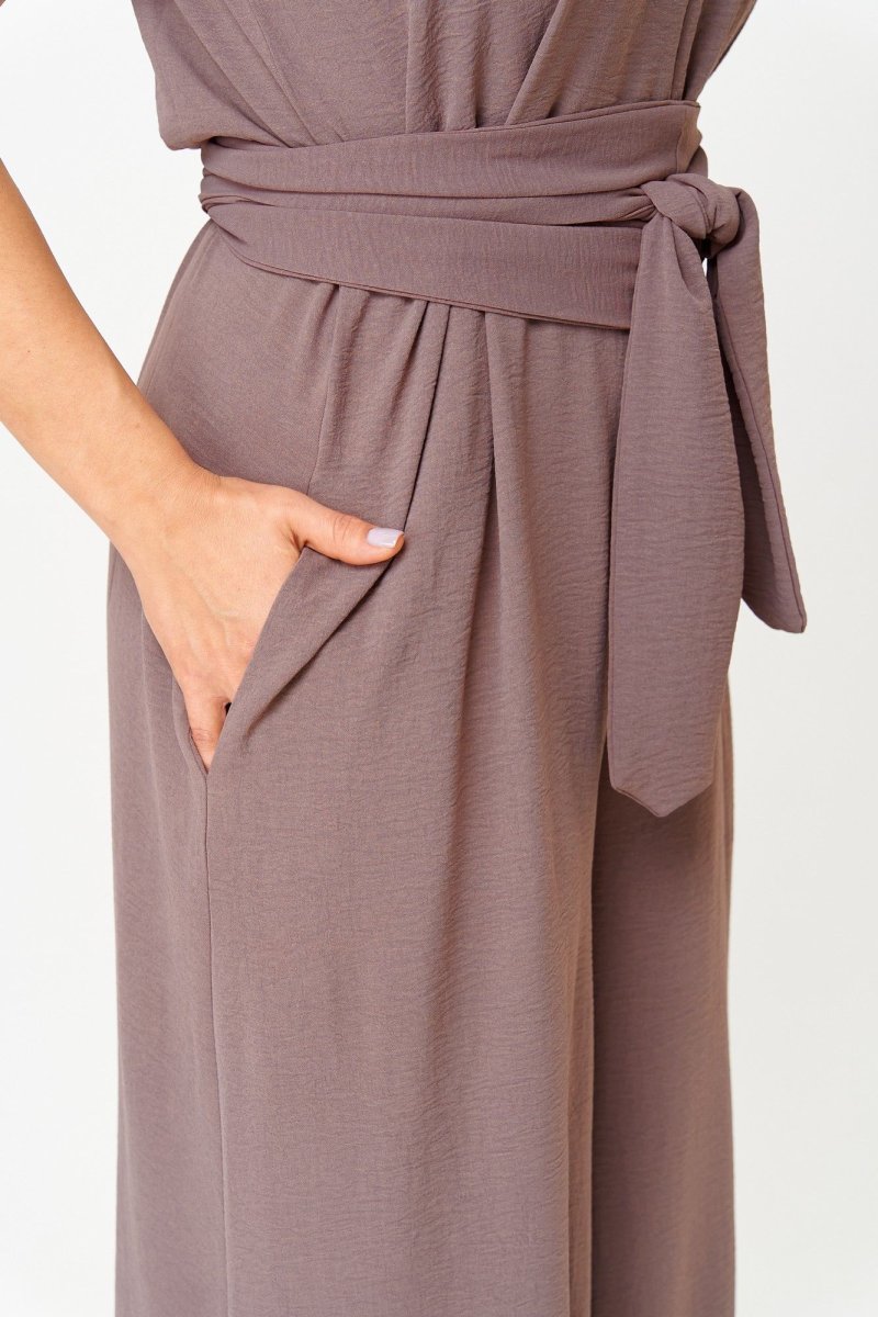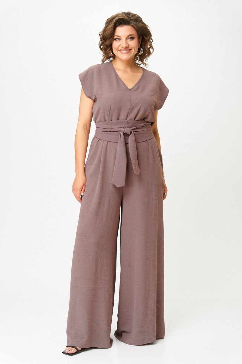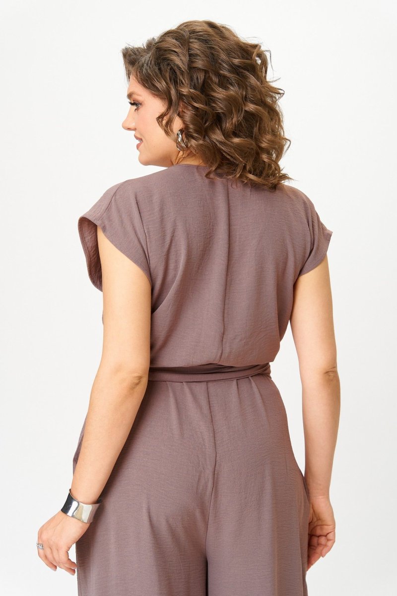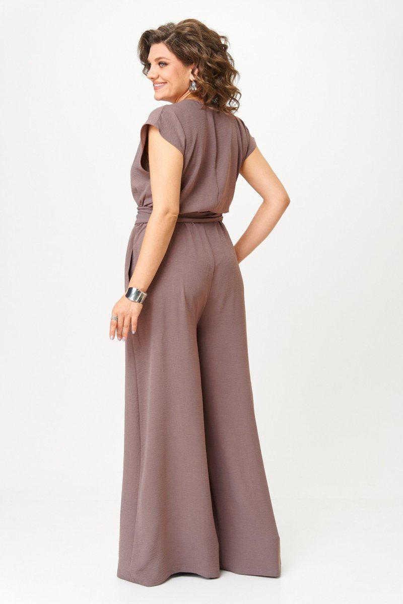 Комбинезон прямого, свободного силуэта, выполнен из однотонной ткани. Полочка комбинезона с V-образной горловиной и застежкой в среднем шве на потайную молнию. Спинка со средним швом. Рукав короткий, цельнокроеный. В области бедер в боковых швах обработаны прорезные карманы. По талии комбинезон фиксируется поясом “кушак”. В нижней части комбинезна половинки брюк широкие, типа “палаццо“.