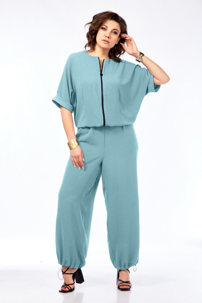Комбинезон свободного силуэта из струящейся ткани, отрезной по линии талии и присобран на резинку. Вырез горловины округлой формы. В верхней части функциональная молния. Рукав спущенный, цельнокраеный, с притачным манжетом. По спинке средний шов. Низ брюк с фиксаторами, можно менять силуэт. В боковых швах карманы.
