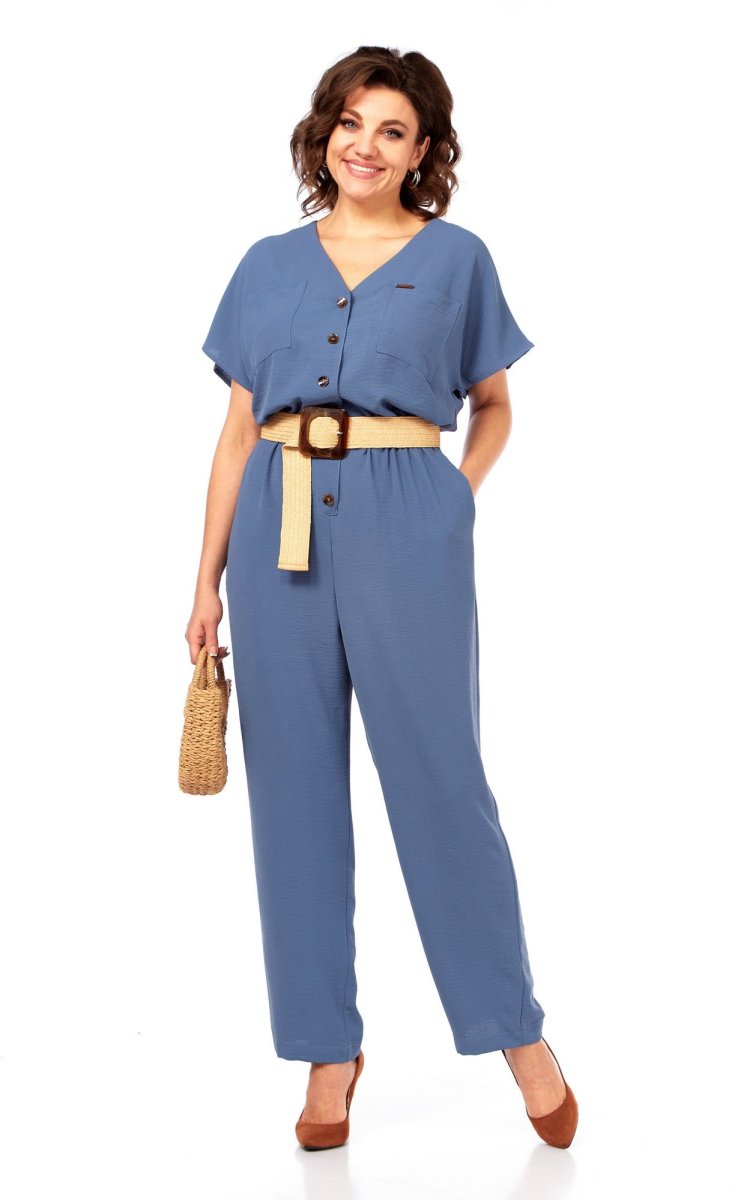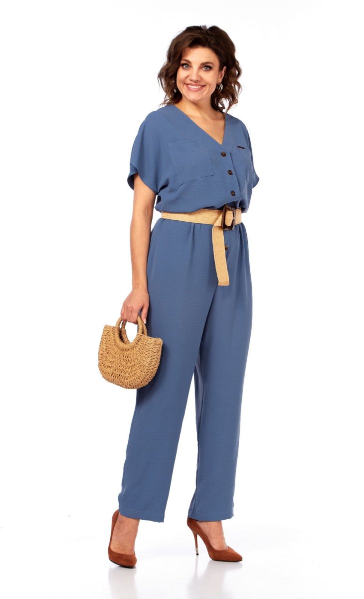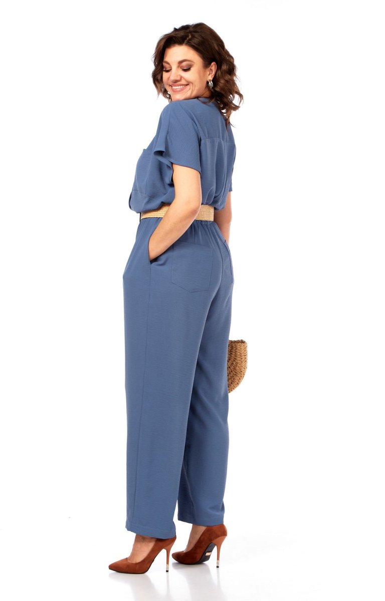 Комбинезон женский свободного силуэта со спущенной линией плеча. По переду центральная застежка на петли-пуговицы. Вырез горловины комбинезона – V-образной формы. В боковых швах – карманы. По линии талии настрочена кулиса с эластичной тесьмой. По переду лифа и задней части брюк настрочены накладные карманы. Комбинезон дополняет съемный пояс-резинка.