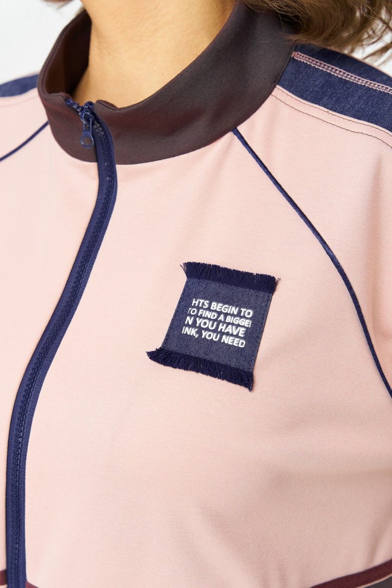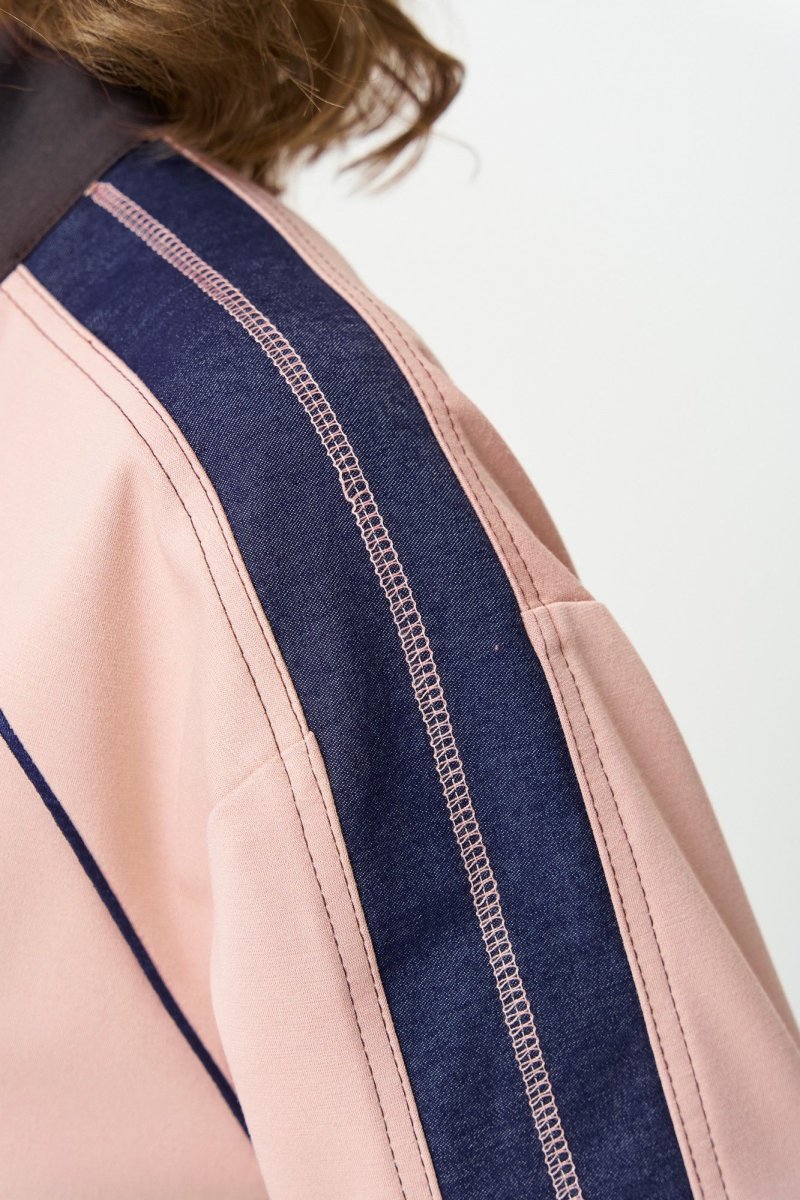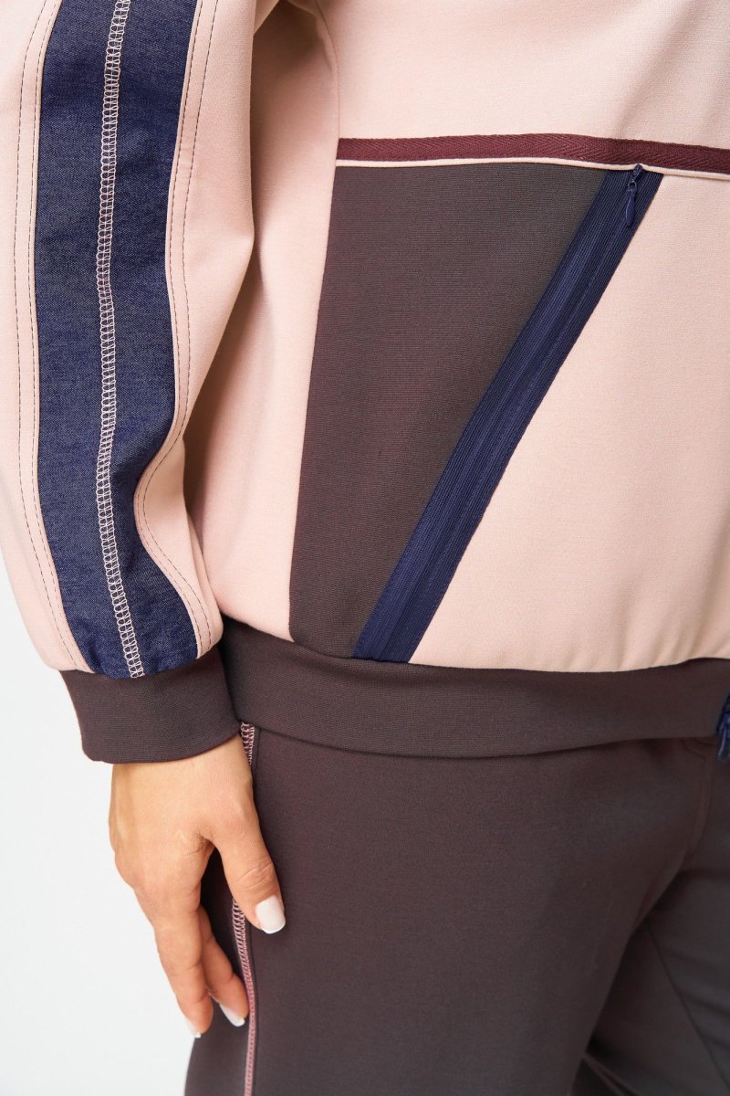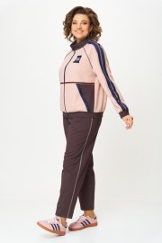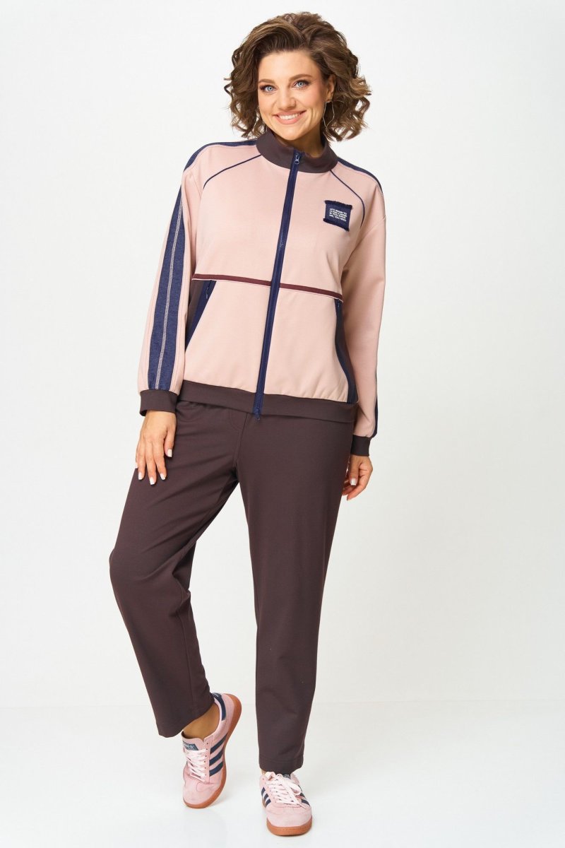 Этот стильный спортивный костюм из двух предметов сочетает в себе практичность и современный дизайн, идеально подходящий для активного образа жизни или повседневной носки. Комплект включает бомбер на молнии и брюки, выполненные в гармоничной цветовой палитре. Бомбер прямого силуэта с центральной застежкой-молнией, выполнен из мягкого трикотажного материала. Основной цвет — нежно-розовый с контрастными вставками темно-синего и шоколадного оттенка на рукавах и груди. Рукава украшены декоративными полосами, а на левой стороне груди расположен декоративный элемент с напечатанным логотипом для акцента. Манжеты и нижний край с резинкой обеспечивают плотную посадку, внутренняя подкладка отсутствует. Брюки, слегка зауженные к низу, свободного силуэта. По переду вблизи боковых швов карманы. По бокам декоративные строчки. Для максимально комфортной посадки по поясу вставлена эластичная резинка. Легкая эластичность материала обеспечивает свободу движению.
