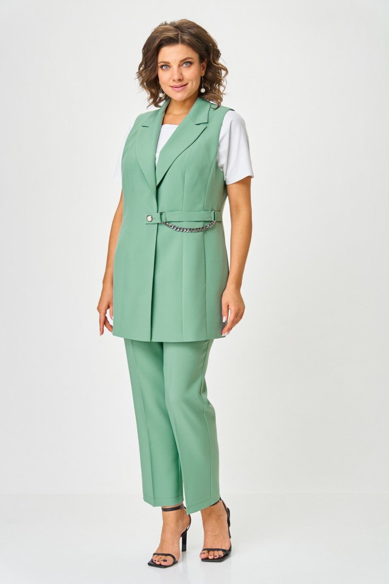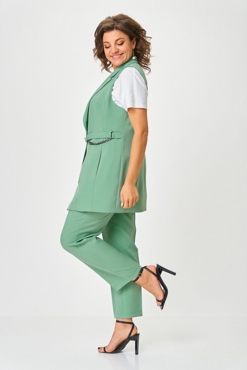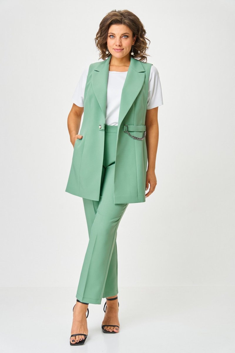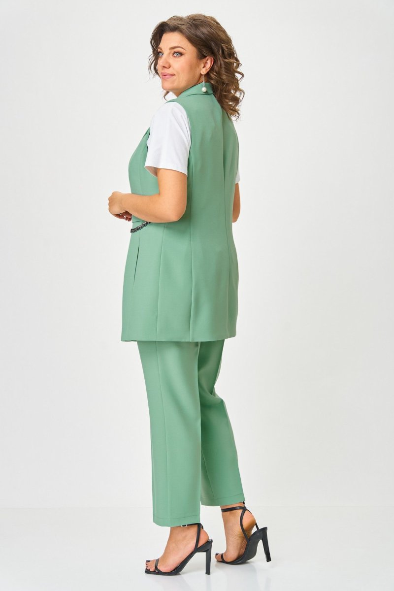 Костюм состоящий из жилета и брюк, выполнен из однотонной ткани. Жилет полуприлегающего силуэта, полочка жилета с вертикальными рельефами, с центральной застежкой на петлю и пуговицу. Горловина V-образной формы, воротник пиджачного типа с отложными лацканами. В рельефе полочки обработаны прорезные карманы. В области талии по полочке с левой стороны выполнен декоративный элемент в виде хлястика с пряжками, и цепью. Цепь сьемная. Спинка со средним швом и вертикальными рельефами. Жилет на подкладке. Брюки классические, прилегающие в области бедер, свободные в колене и немного зауженные к низу. По передним половинкам выполнены наклонные карманы, в среднем шве застежка на молнию. По задним половинкам выполнены талиевые вытачки. Брюки на притачном поясе с эластичной тесьмой и застежкой на петлю и пуговицу. Брюки со стрелками