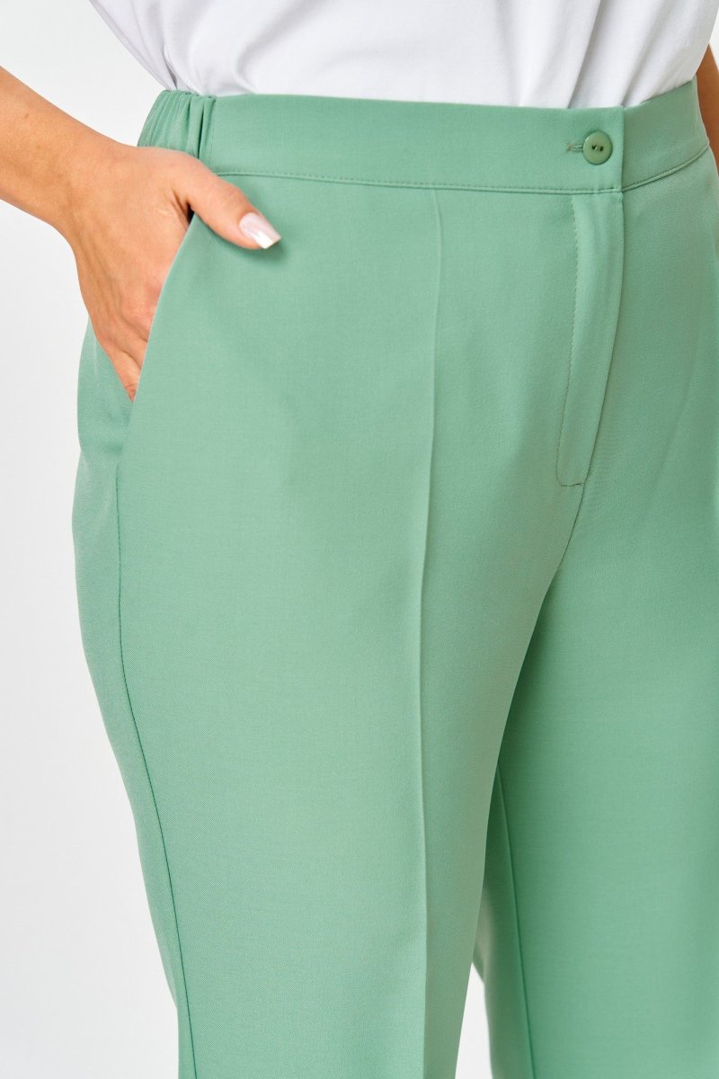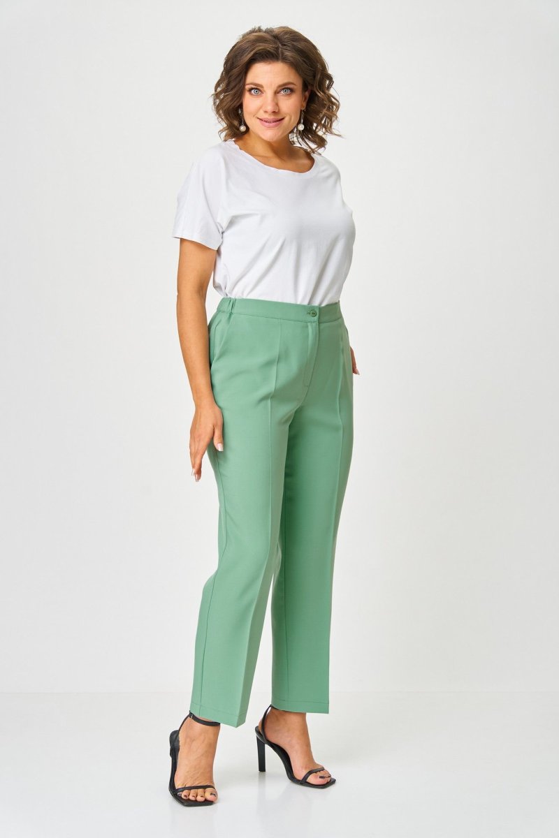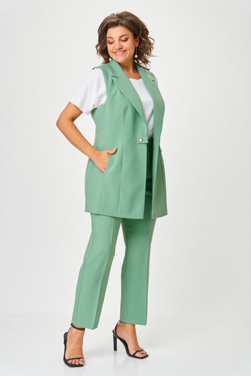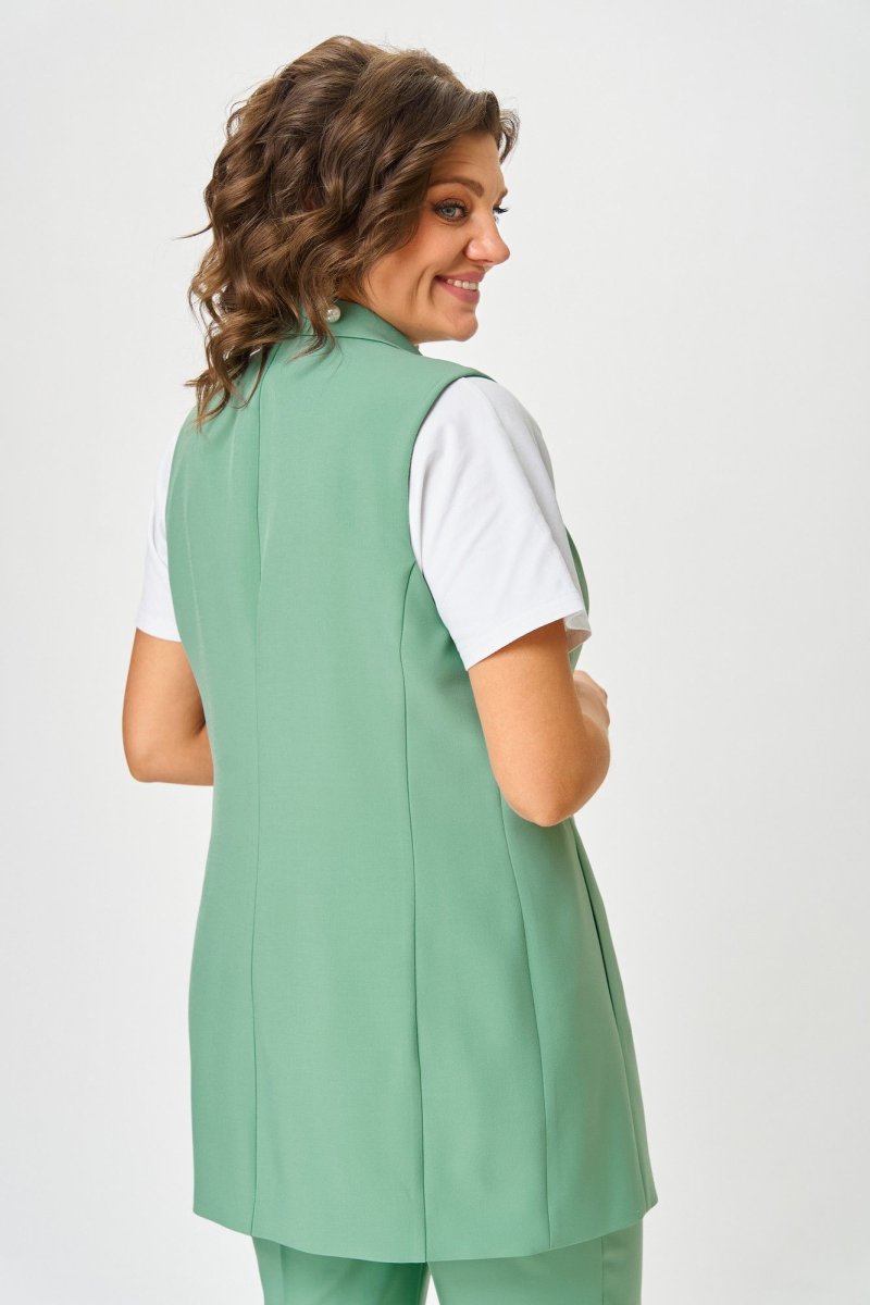 Костюм состоящий из жилета и брюк, выполнен из однотонной ткани. Жилет полуприлегающего силуэта, полочка жилета с вертикальными рельефами, с центральной застежкой на петлю и пуговицу. Горловина V-образной формы, воротник пиджачного типа с отложными лацканами. В рельефе полочки обработаны прорезные карманы. В области талии по полочке с левой стороны выполнен декоративный элемент в виде хлястика с пряжками, и цепью. Цепь сьемная. Спинка со средним швом и вертикальными рельефами. Жилет на подкладке. Брюки классические, прилегающие в области бедер, свободные в колене и немного зауженные к низу. По передним половинкам выполнены наклонные карманы, в среднем шве застежка на молнию. По задним половинкам выполнены талиевые вытачки. Брюки на притачном поясе с эластичной тесьмой и застежкой на петлю и пуговицу. Брюки со стрелками