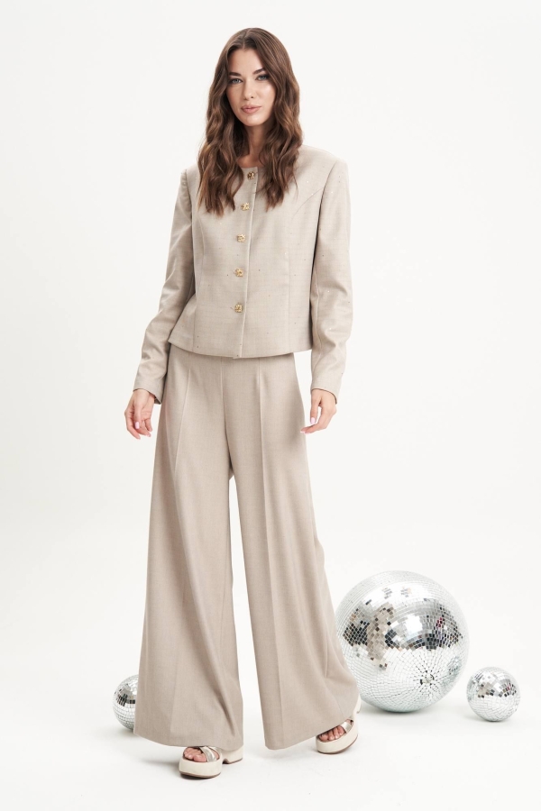 Костюм состоящий из блузки и брюк выполнен из однотонной ткани. Блузка свободного прямого силуэта. Полочка блузки с центральной застежкой в виде притачной планки с пуговицами и петлями. В верхней части полочки обработана отрезная кокетка, в области груди обработаны накладные карманы с клапанами. Горловина круглой формы с воротником рубашечного типа. Спинка цельная. Рукав цельнокроеный, длиной за локоть, по низу рукав на притачной манжете с эластичной тесьмой. Низ блузки ассиметричный, спинка длиннее полочки, с закругленным низом по боковым швам. Брюки свободные, прямые. По передним половинкам обработаны наклонные карманы. По низу брюк обработана широкая притачная планка, по нижней части бокового шва обработаны разрезы. Пояс брюк притачной с эластичной тесьмой.