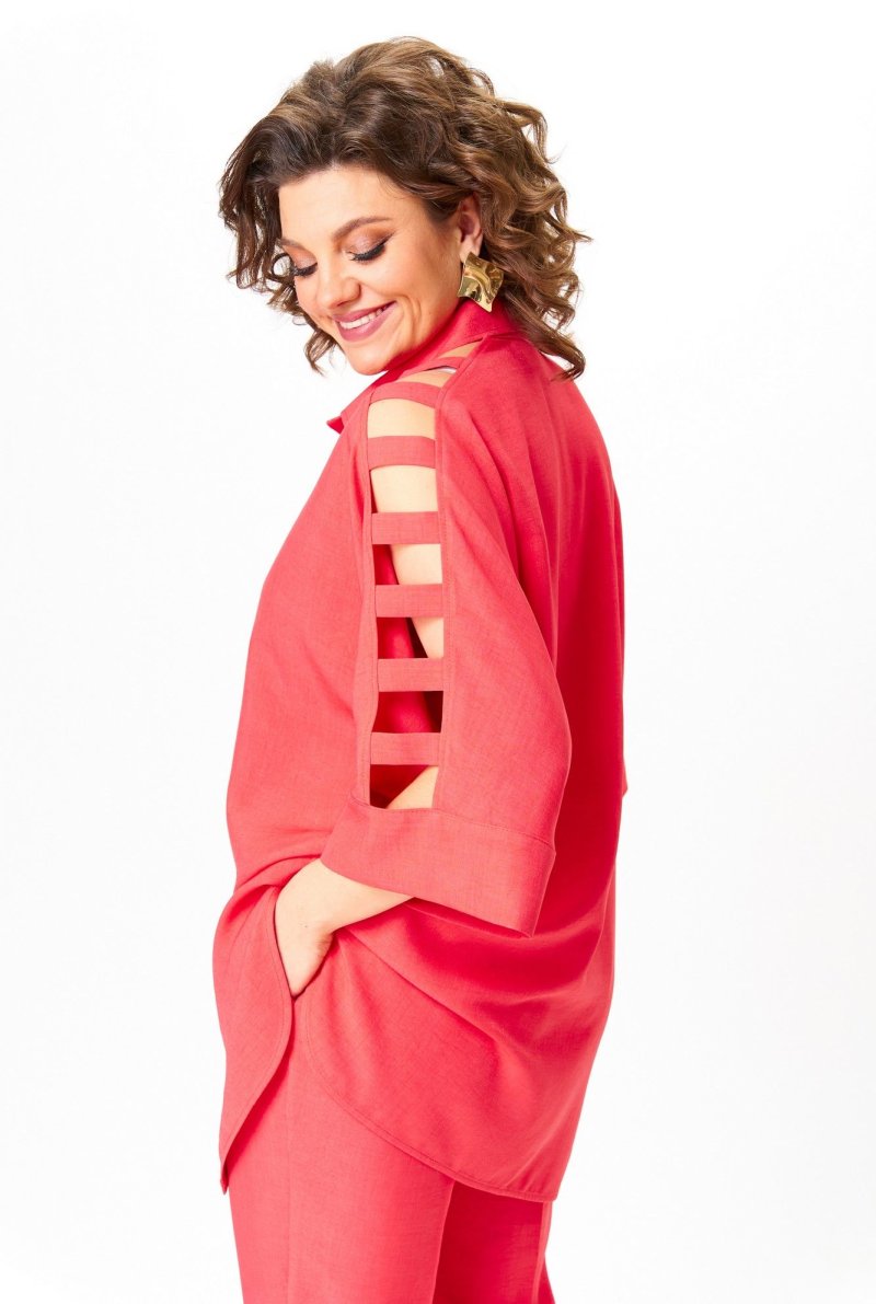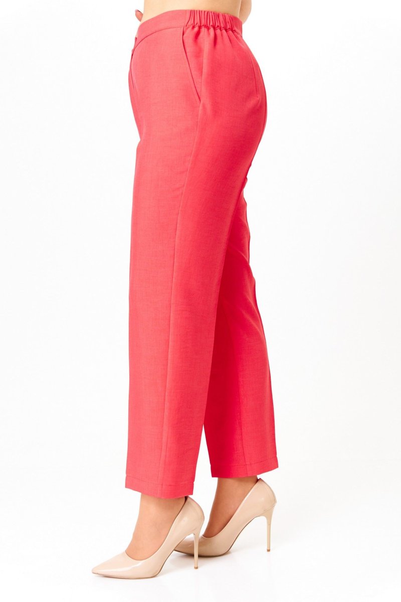 Костюм состоящий из блузки и брюк выполнен из однотонной ткани.