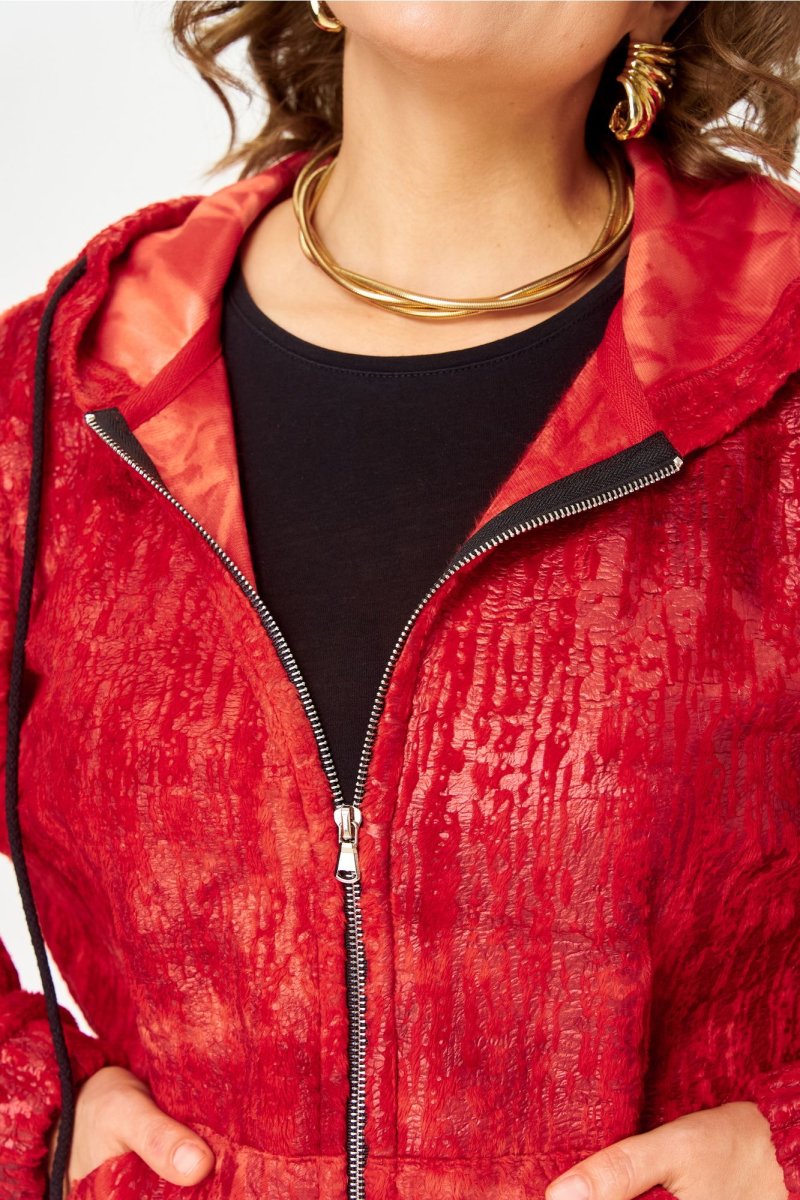Худи на молнии. На полочке обработан накладной карман “кенгуру“. Горловина круглой формы с капюшоном. Спинка цельная. Линия плеча удлиненная, пройма углубленной формы. Рукав одношовный, рубашечного типа. Низ рукава и низ худи на притачной манжете с резинкой.