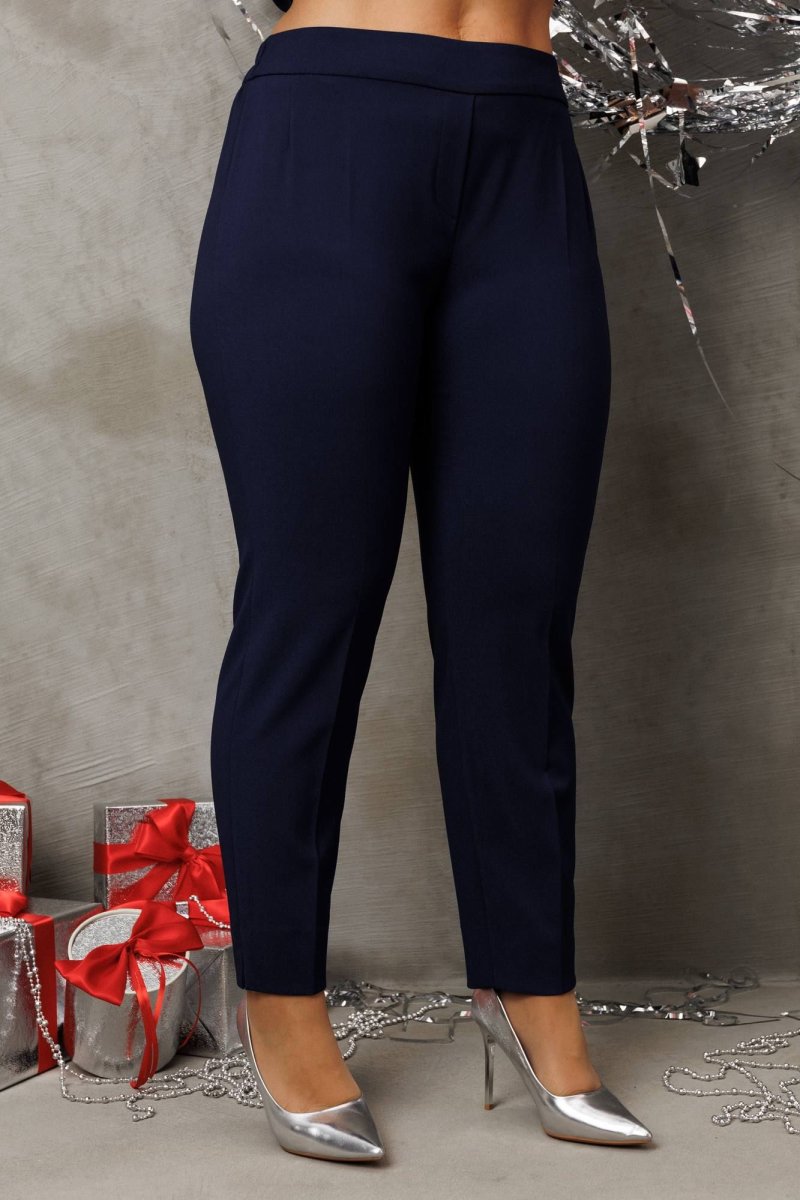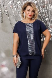 Комплект брючный женский, состоящий из блузы и брюк. Блуза свободного покроя со спущенной линией плеча, без рукава, по низу изделия манжета, в которой сзади вставлена эластичная тесьма, по переду от горловины до низа изделие-вставка из ткани с пайетками, вырез горловины "лодочка". Брюки узкие, на поясе -кокетке, по спинке с эластичной тесьмой, длина 7/8, с разрезиками по низу, со стрелками.