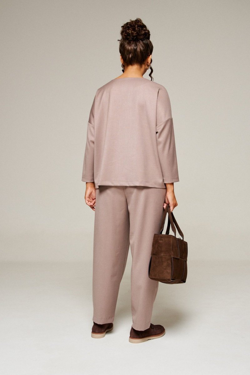 Брюки свободного силуэта расширенные вверху и слегка зауженные внизу, длиной до щиколотки, с двумя верхними боковыми карманами и двумя заложенными глубокими складками от пояса спереди.