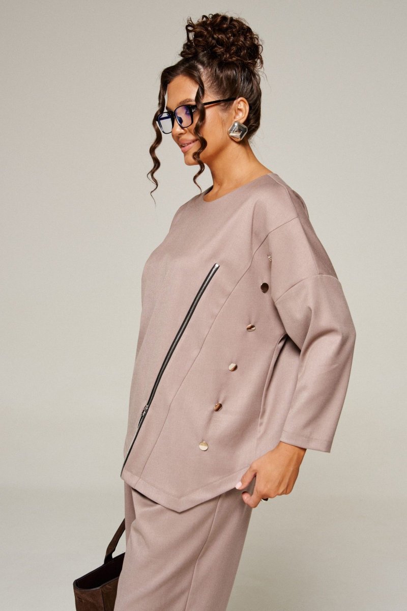 Перед из двух асимметричных деталей. Правая часть с нагрудной вытачкой от бокового шва и с отделочным элементом - молния, левая с отелочными пуговицами. Спинка цельная.
