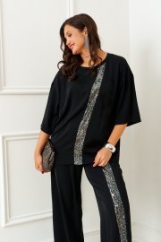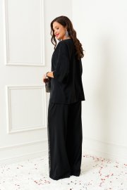 Изысканный костюм состоит из 2-ух предметов: блузки и брюк. Выполнен из костюмно-смесового полотна. У этой ткани нежная, гладко-бархатистая фактура, приятная на ощупь и матовая поверхность. Она легко драпируется и очень выгодно и дорого подчёркивает образ.