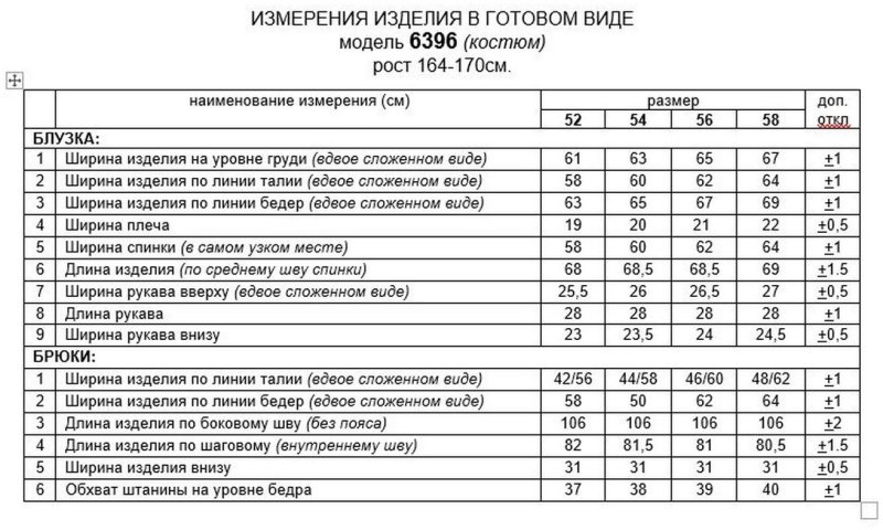 Таблица размеров