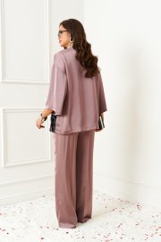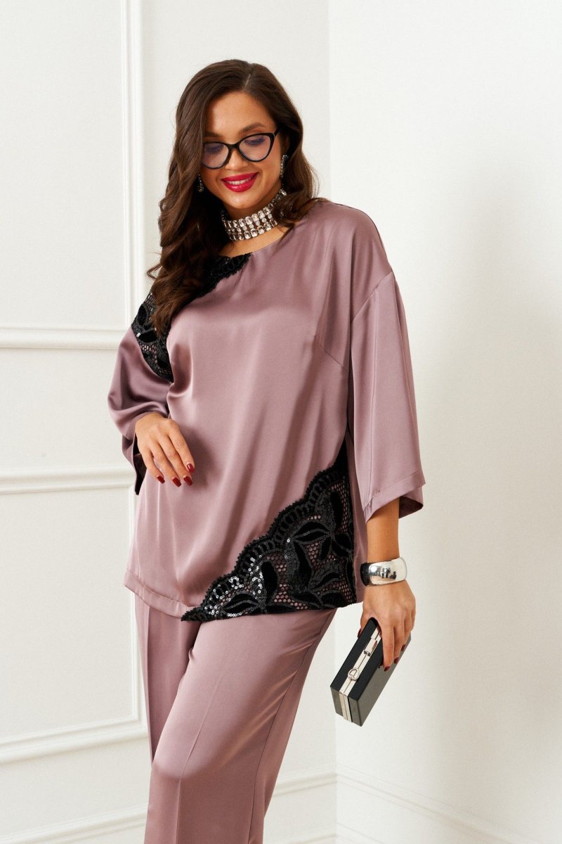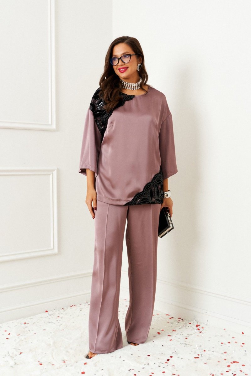 Изысканный костюм состоит из 2-ух предметов: блузки и брюк. Выполнен из атласного полотна в сочетании с кружевом. Основная ткань нежная, гладкой фактуры, приятная на ощупь и с блестящей поверхностью, она легко драпируется и очень выгодно и дорого подчёркивает образ; отделочная ткань придает праздничный шарм.