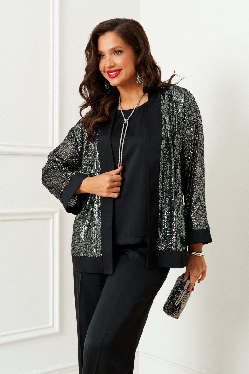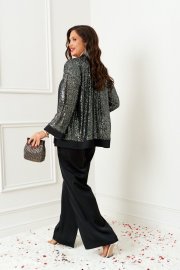 Брючный комплект в комбинации сияющего роскошного атласа с эксклюзивным полотном с пайетками не останется незаметным в главную новогоднюю ночь!