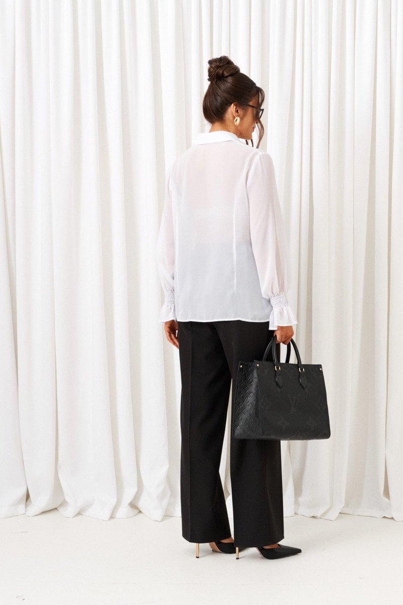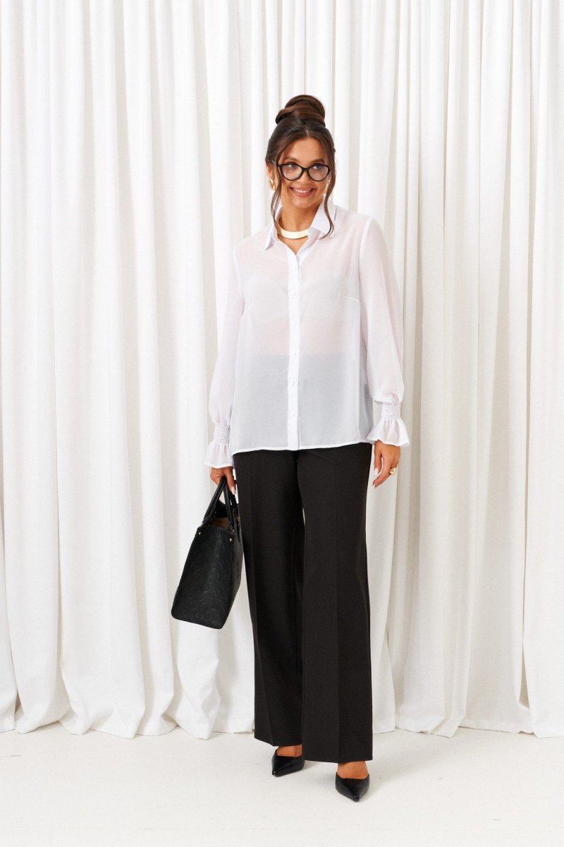 Деловой комплект 3-ка, состоящий из трех предметов: жилета, брюк и блузки. Блузка рубашечного типа выполнена из легкой, струящейся шифоновой ткани. Передняя часть блузки цельнокроеная с двумя нагрудными вытачками. Застежка центральная на петли и пуговицы. Спинка цельнокроеная с двумя вытачками на уровне талии. Нижний край блузы ровный. Воротник отложной рубашечный, на отрезной стойке. Рукав длинный одношовный втачной. Нижний край рукава декоративный с широкой оборкой. Брюки классические прямые длинные выполнены из костюмно-смесового полотна с нежной, гладко-бархатистой фактурой, приятной на ощупь и матовой поверхностью; В верхней части брюк расположены функциональные карманы. Посадка стандартная высокая. Пояс притачной с резинкой по кругу. Жилет полуприлегающего силуэта; выполнен из костюмно-смесового полотна отличительного дизайна; на подкладке. Передняя часть с вертикальными рельефами от проймы. Спинка разрезная по среднему шву и вытачками на талии от низа. Горловина округлой формы, переходящая в борт с выступом. Застежка смещенная по наклонной на прорезные петли и четыре видимые декоративные и одну потайную пуговицы.