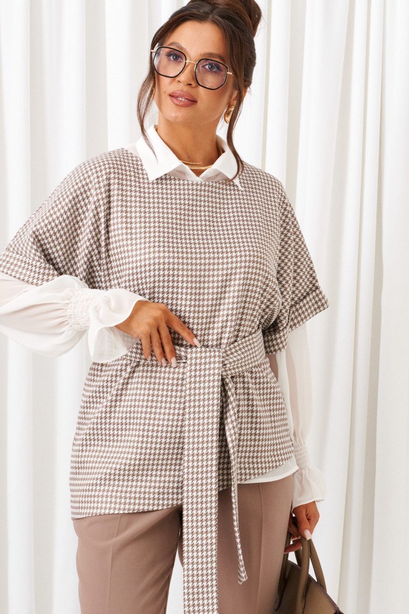 Блузка рубашечного типа выполнена из легкой, струящейся шифоновой ткани.