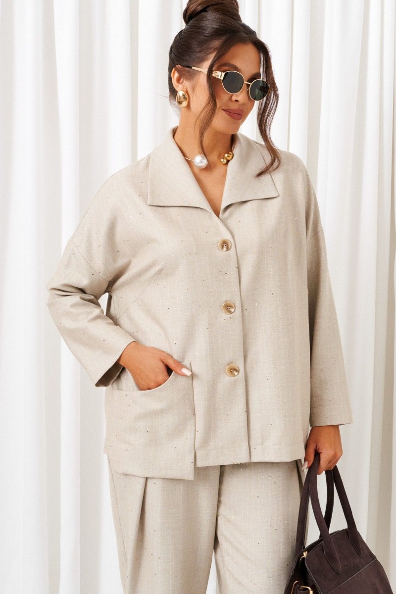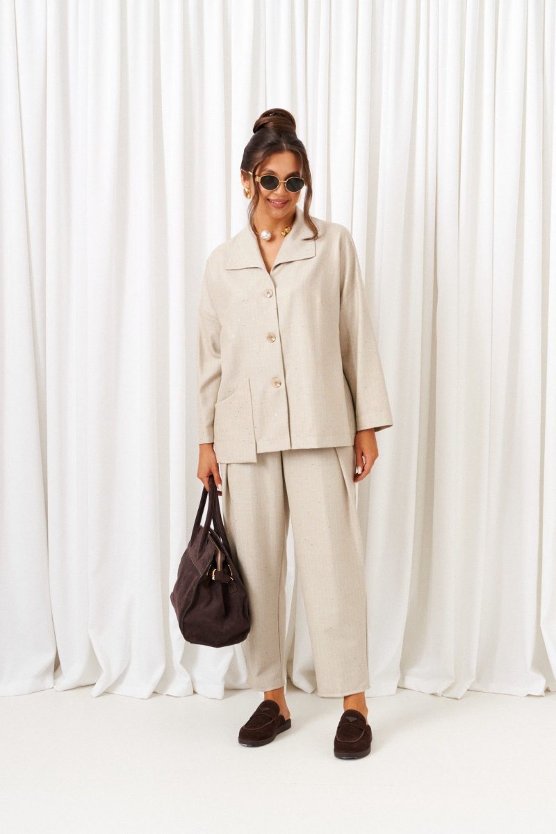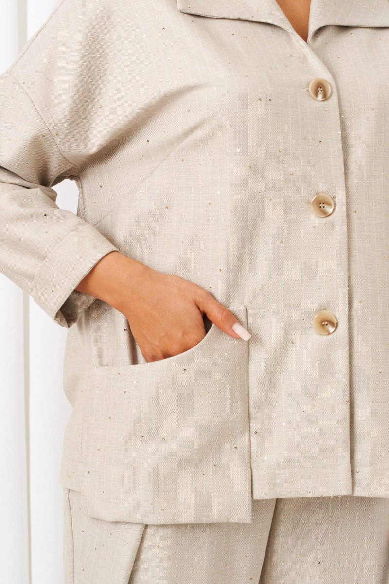 Стильный повседневный женский костюм в винтажном стиле, дополненный акцентным асимметричным накладным карманом, весьма актуален в будущем сезоне. Предметы костюма можно смело комбинировать по отдельности с другими вещами гардероба. Костюм состоит из 2-х предметов одежды: рубашки и брюк. Выполнен из костюмной ткани стильного дизайна с содержанием натуральных волокон. Рубашка прямого силуэта свободного кроя. Перед из двух симметричных деталей с нагрудными вытачками от бокового шва. Асимметричность изделию придает нижний накладной карман слева фантазийной формы. Спинка цельная. Рукав рубашечный одношовный полной длины с возможностью отворота. Застежка передняя центральная на три прорезные петли и декоративные пуговицы. V-образный вырез горловины. Воротник типа «апаш», цельнокроеный с передом. Брюки прямого силуэта свободные вверху и слегка зауженные к низу, длиной до щиколотки, с двумя верхними боковыми карманами и двумя заложенными глубокими складками от пояса спереди. Высота сиденья классическая. Застежка центральная на молнию и на петлю с пуговицей на поясе. Брюки на притачном поясе, в задней части которого для удобного прилегания по талии вставлена резинка.