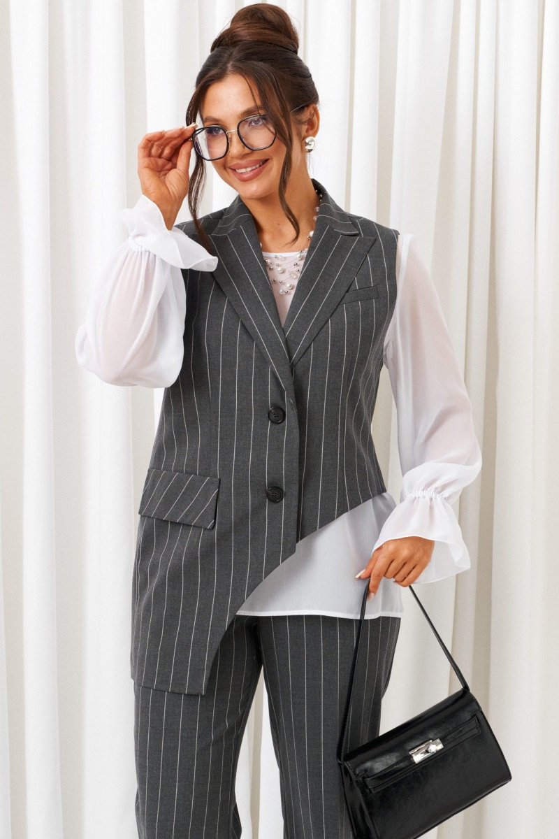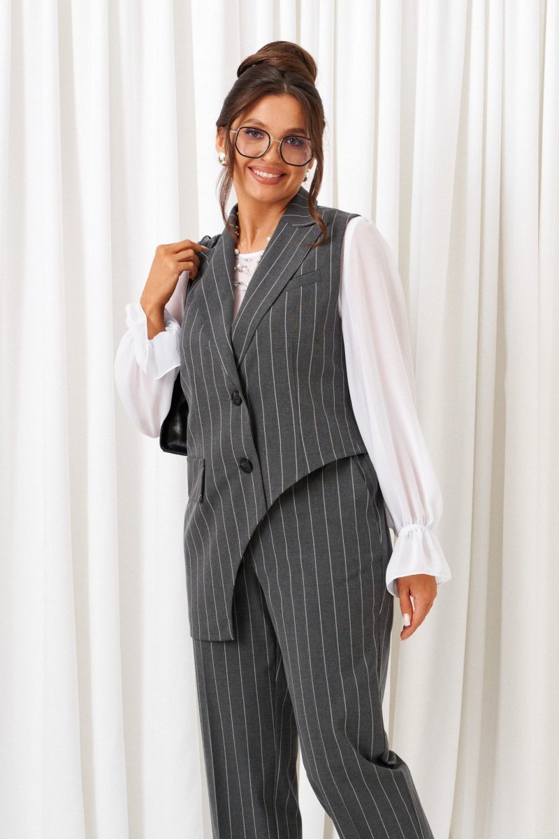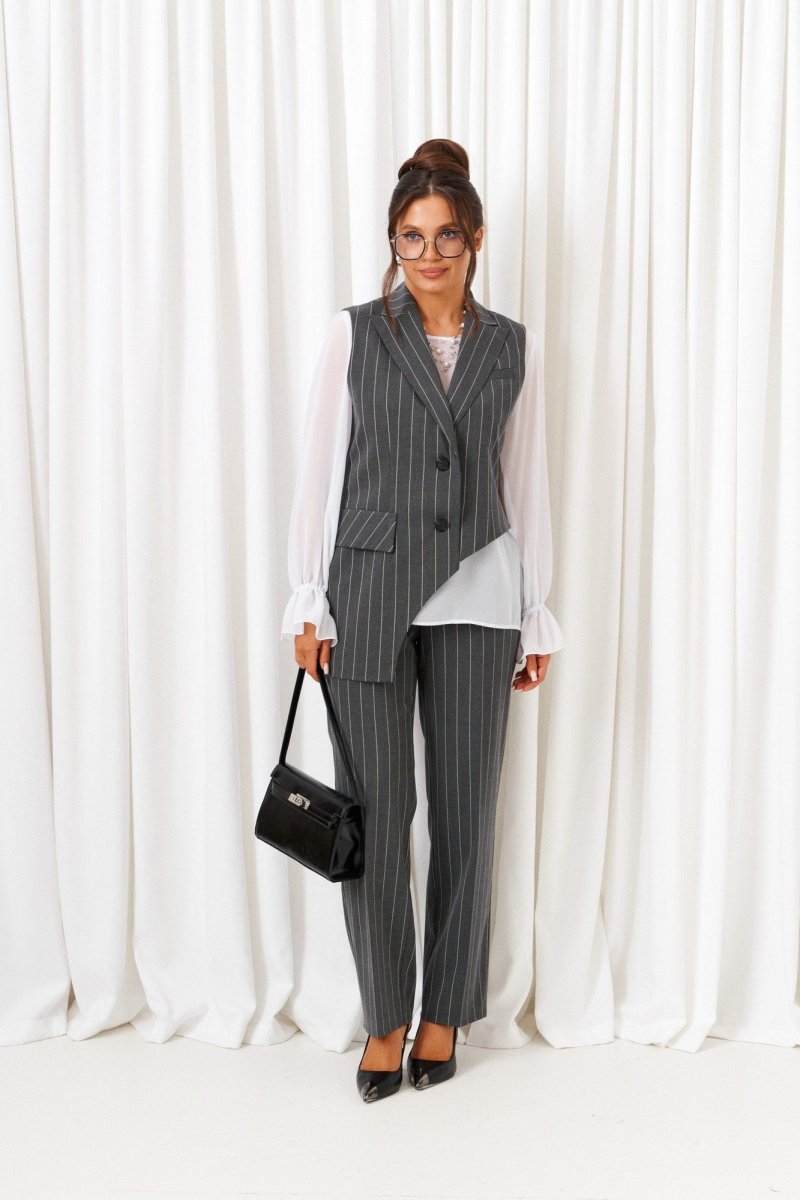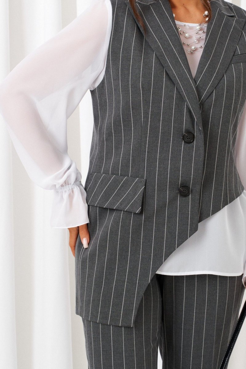 Деловой женский костюм 3-ка, состоящий из предметов: жилета, брюк и блузки. Жилет и брюки выполнены из элегантной и утонченной костюмной ткани стильного дизайна в полоску, отличающейся дорогим и роскошным внешним видом. Жилет асимметричный однобортный полуприлегающего силуэта, на подкладке. Передняя часть жилета с двумя смещенными боковыми рельефами от проймы и вытачками от горизонтального подреза, в котором располагается карман в рамку с клапаном. Слева вверху расположена нефункциональная листочка. Спинка разрезная по среднему шву и двумя дополнительными вертикальными рельефами. Воротник классический пиджачного типа с лацканами. Застежка центральная, на две петли и декоративные пуговицы. Блузка прямого силуэта выполнена из легкой и воздушной мягкой ткани шифон. Передняя часть блузы цельнокроеная с двумя нагрудными вытачками. Спинка цельная. Горловина округлой формы. Рукав длинный одношовный втачной, заканчивается широкой свободной оборкой от кулисы с резинкой. Брюки классические длинные с функциональными боковыми карманами в верхней части переда. Посадка стандартная. Застежка центральная на застежку молнию и петлю с пуговицей на поясе. В задней части пояса для удобства при использовании вставлена резинка.