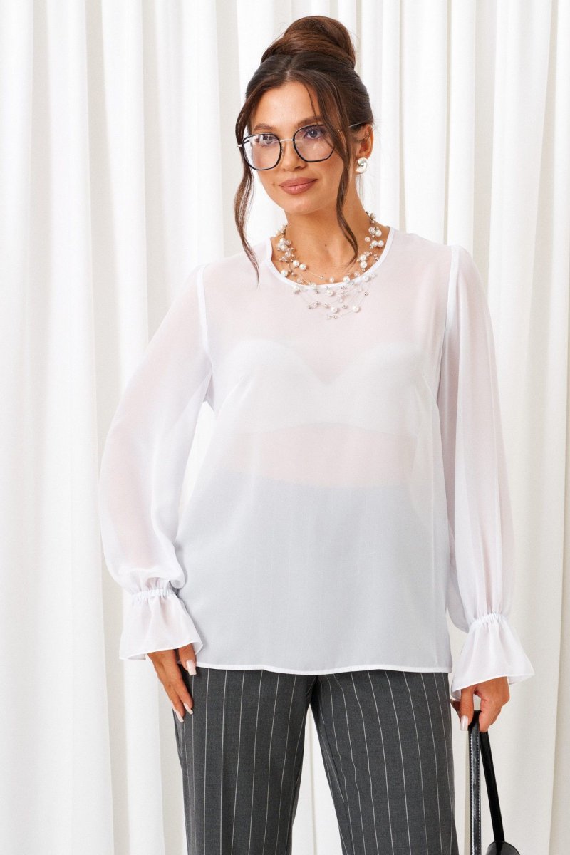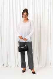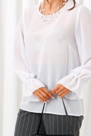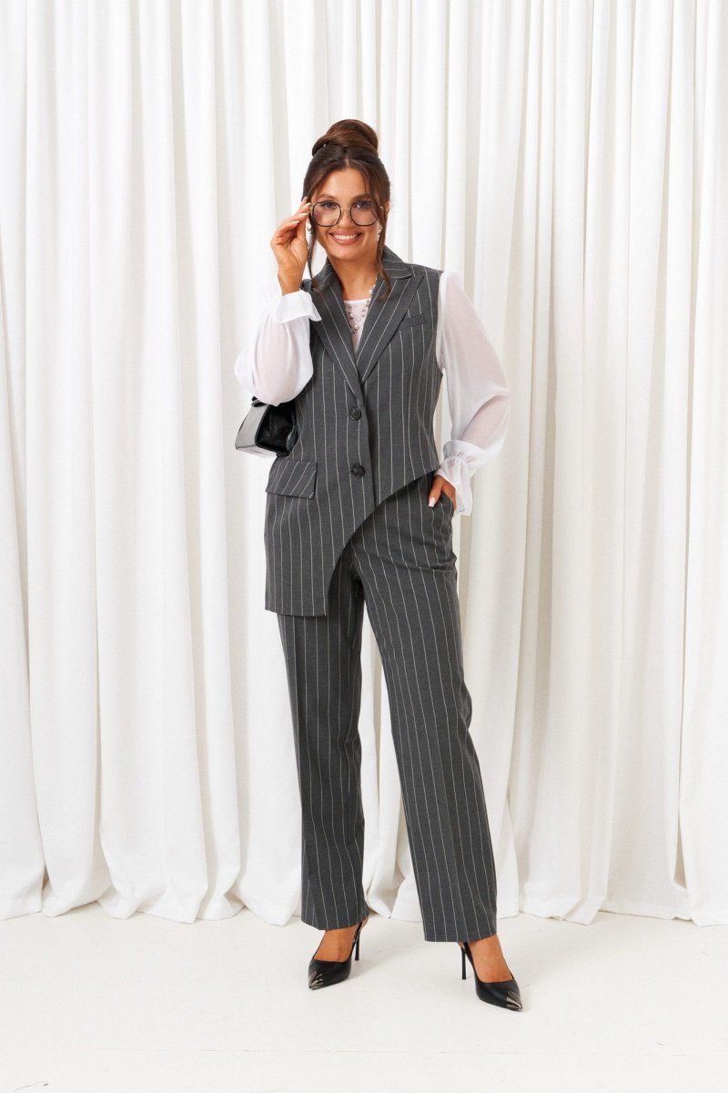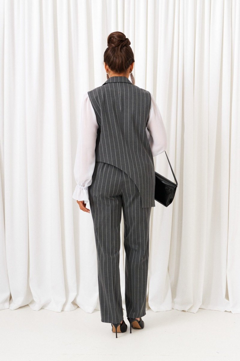Деловой женский костюм 3-ка, состоящий из предметов: жилета, брюк и блузки. Жилет и брюки выполнены из элегантной и утонченной костюмной ткани стильного дизайна в полоску, отличающейся дорогим и роскошным внешним видом. Жилет асимметричный однобортный полуприлегающего силуэта, на подкладке. Передняя часть жилета с двумя смещенными боковыми рельефами от проймы и вытачками от горизонтального подреза, в котором располагается карман в рамку с клапаном. Слева вверху расположена нефункциональная листочка. Спинка разрезная по среднему шву и двумя дополнительными вертикальными рельефами. Воротник классический пиджачного типа с лацканами. Застежка центральная, на две петли и декоративные пуговицы. Блузка прямого силуэта выполнена из легкой и воздушной мягкой ткани шифон. Передняя часть блузы цельнокроеная с двумя нагрудными вытачками. Спинка цельная. Горловина округлой формы. Рукав длинный одношовный втачной, заканчивается широкой свободной оборкой от кулисы с резинкой. Брюки классические длинные с функциональными боковыми карманами в верхней части переда. Посадка стандартная. Застежка центральная на застежку молнию и петлю с пуговицей на поясе. В задней части пояса для удобства при использовании вставлена резинка.