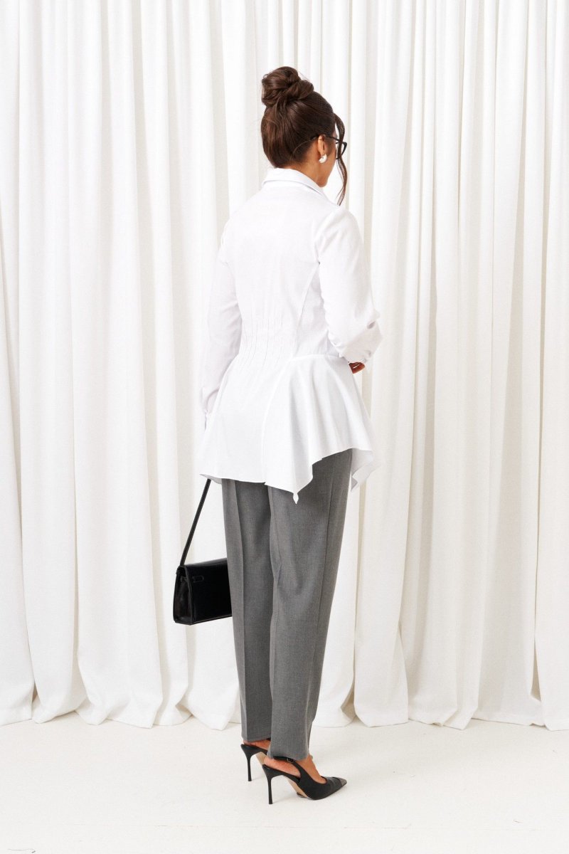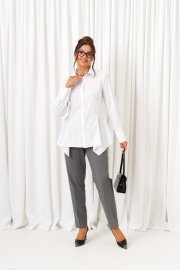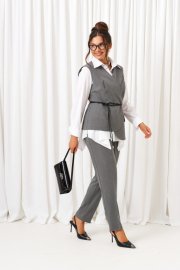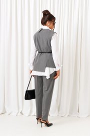 Созданный отличительным кроем с подчеркнутыми деталями, комплект задаст уверенное настроение образу и подчеркнет индивидуальность при любом случае выхода. Выразительный комплект состоит из жилета, брюк и рубашки, выполнен из смесовой ткани с натуральными волокнами, практичен в носке. Жилет полуприлегающего силуэта, двубортный, асимметричный разноуровневый. На подкладке. Передняя часть из двух половинок, с вертикальными рельефами от плеча. На левой полочке расположен прорезной нижний карман с обтачкой и клапаном, вырез горловины оформлен пиджачным воротником с лацканом. Правая полочка укорочена и без дополнительных элементов. Спинка со средним швом и с вертикальными рельефами от плеча. Правый рельеф заканчивается функциональным разрезом-шлица. Застёжка смещенная на потайные петли и пуговицы. Низ борта округлый. Дополнительным элементом служит декоративный пояс из экокожи. Брюки классические, длиной до щиколотки, слегка заужены внизу, с высокой посадкой. В верхней части спереди брюк расположены функциональные карманы и складки от пояса. Застежка центральная на молнию. Пояс широкий, с застёжкой на две пуговицы. В задней части пояса брюк вставлена резинка. Блузка рубашечного типа выполнена из хлопковой ткани. Передняя часть блузки с нагрудными вытачками и с подрезными боковыми частями. Спинка цельная по середине, с подрезными боковыми частями и защипами на талии. Блузка с декоративными вставками в нижней части, которые задают силуэтное расширение в области бедер. Нижний край блузы неровный. Воротник рубашечный, на стойке. Застежка центральная на петли и пуговицы. Рукав длинный, одношовный, втачной. Нижний край рукава обработан широкой манжетой с застежкой на петлю и пуговицу. При желании потребителя манжета может быть использована в подвернутом виде. Длина жилета (по среднему шву спинки) – 69 см. Длина рукава жакета – 21,5 см Длина брюк (по боковому шву с поясом) – 100 см.