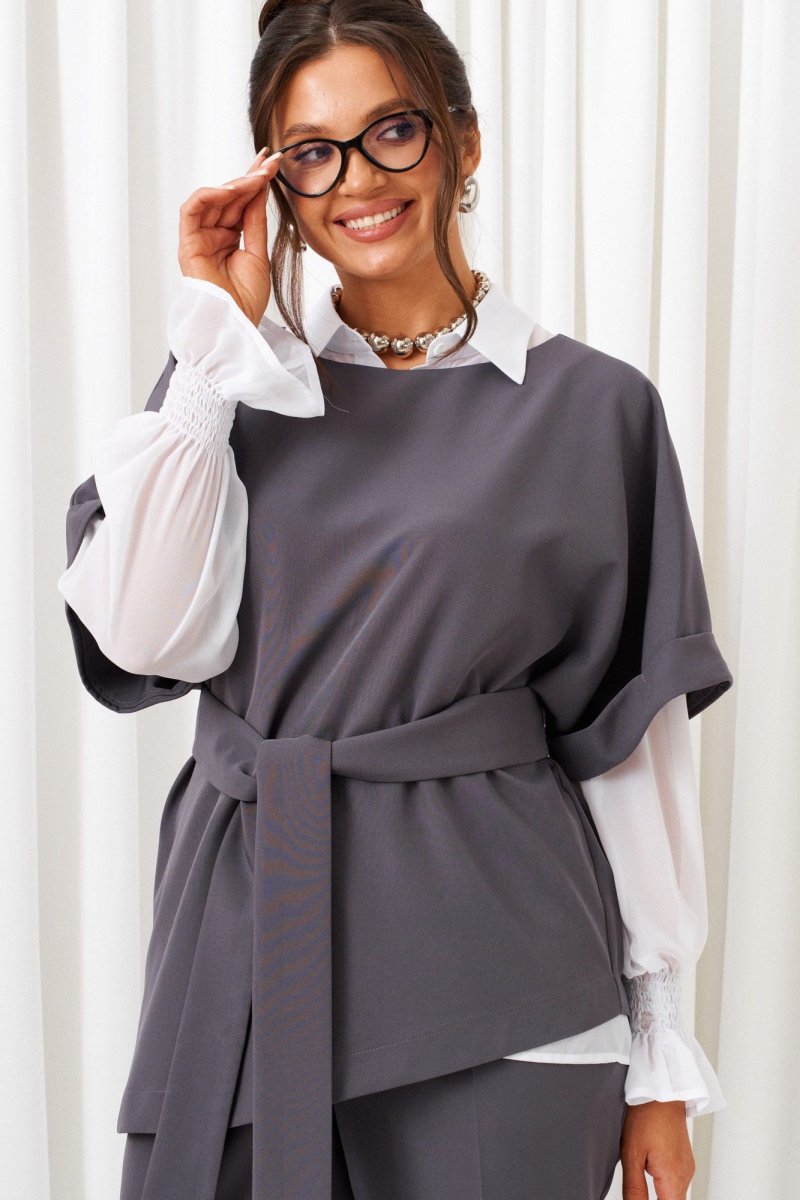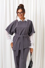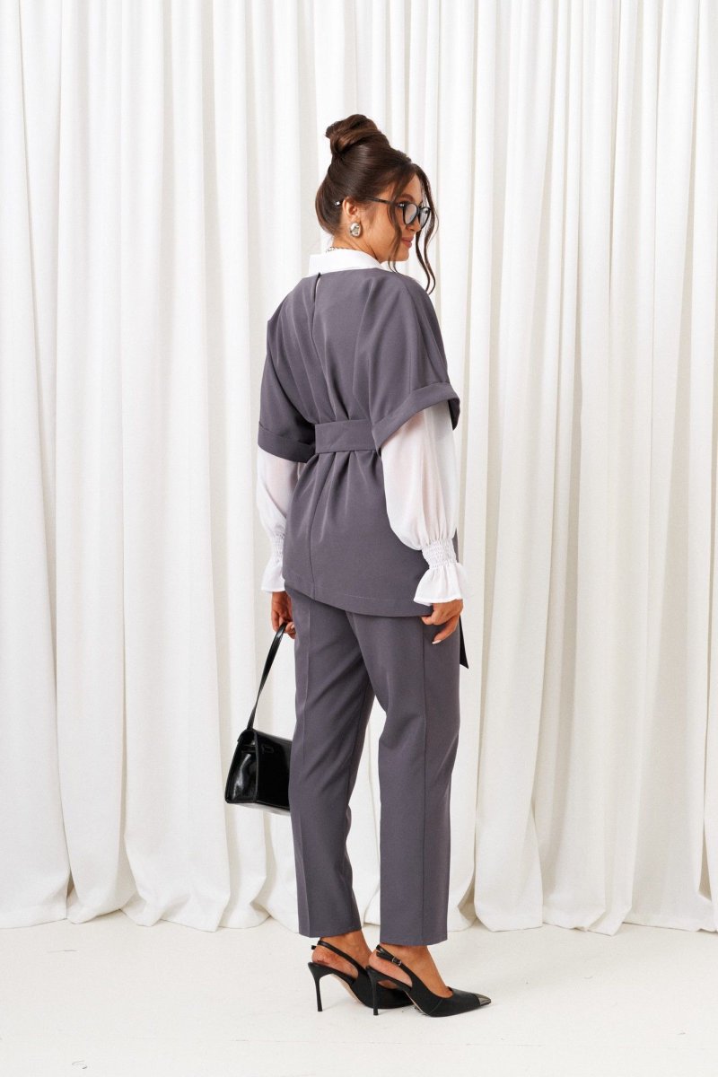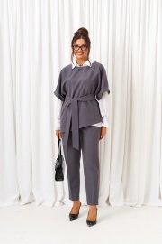 Деловой комплект 3-ка, состоящий из трех предметов: блузки, брюк и жилета. Жилет и брюки выполнены из костюмно-смесового полотна с нежной бархатистой поверхностью, приятной на ощупь и отличительно красивого внешнего вида. Блузка рубашечного типа выполнена из легкой, струящейся шифоновой ткани. Передняя часть блузки с двумя нагрудными вытачками. Спинка цельнокроеная с двумя выточками на уровне талии. Рукав длинный одношовный, втачной. Нижний край рукава декоративный. Застежка центральная на петли и пуговицы. Воротник рубашечный, на стойке. Брюки классической посадки, со складками от пояса. Пояс широкий, сзади вставлена резинка. В верхней части брюк расположены функциональные карманы. Застежка центральная на молнию и на две петли и пуговицы на поясе. Жилет свободного кроя со спущенной линией плеча. Передняя часть цельнокроеная. Спинка разрезная по среднему шву, в верхней части которого расположен разрез с застёжкой на одну навесную петлю и пуговицу. Горловина округлой формы, обработана обтачкой. Рукав цельнокроеный с притачной манжетой. В комплекте предусмотрен пояс-завязка шириной 6см.