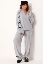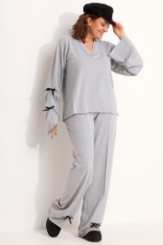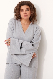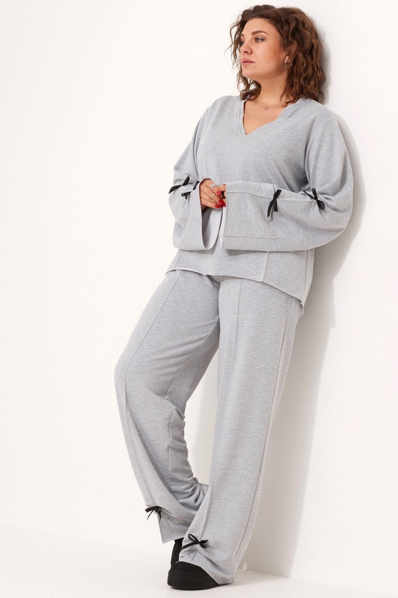 Комплект женский свободного кроя, состоящий из лонгслива и брюк, несомненно, станет любимчиком в Вашем гардеробе! Модель выполнена из приятного хлопкового трикотажа. На разных деталях комплекта застрочены декоративные стрелки, что позволяет визуально «вытянуть» силуэт. Горловина лонгслива V-образной формы со свободным срезом обработана притачной обтачкой. Рукав втачной со слегка спущенной проймой, расклешённый к низу. Спинка длиннее полочки и имеет форму полукруга по низу.