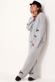 Низ лонгслива, низ рукавов и низ брюк имеют открытый срез, обработанный на плоскошовной машине.