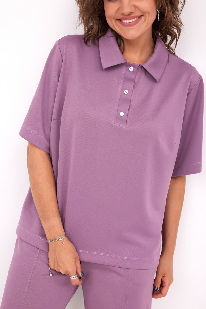 Блуза - поло свободного кроя с отложным воротником на планке визуально удлиняет линию шеи. Рукав втачной с подгибкой по линии низа. На спинке в районе плеча расположены вытачки. В боковых швах - разрезы, обработанные подгибкой. Спинка длиннее переда.