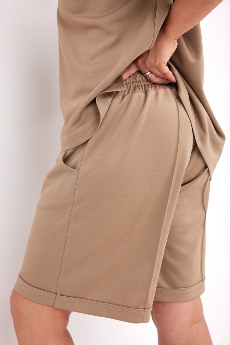 Шорты свободного прилегания, дополнены карманами «Хулиганами». По передней части застрочены стрелки. Верх шорт обработан широким поясом с островком с эластичной резинкой. Нижний край шорт обработан подгибкой с закрытым швом по лицевой части изделия.