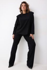 Лонгслив свободного кроя с цельной декоративной планкой по передней и задней части. Благодаря конструктивным особенностям модель делает акцент на линии плеча и создаёт дополнительную вертикаль, что невероятно стройнит и вытягивает силуэт! Горловина обработана обтачкой с открытым срезом. Низ рукава и низ изделия имеют открытые срезы. На плечах металлические декоративные зажимы золотистого цвета.