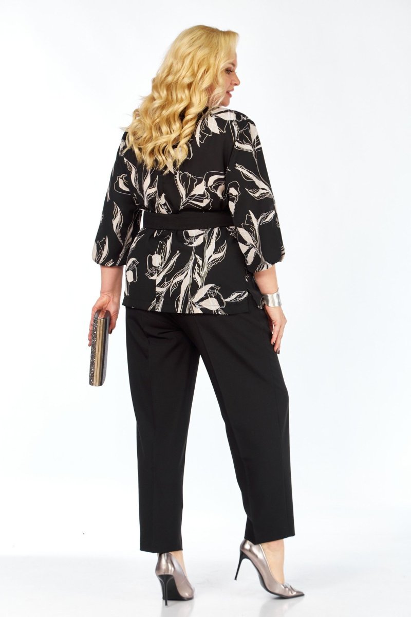 Комплект женский брючный 2-х предметный. Блузка прямого силуэта выполнена из струящейся принтованной ткани, выглядит эффектно, создает современный стиль образу. Горловина аккуратной округлой формы. Рукав втачной, свободный с фантазийным решением, длина 7/8. В комплект входит пояс, низ обработан металлической бахромой, что служит элементом украшения. Средний шов спинки вверху переходит в застежку на 6 навесных петель, пуговиц. В боковых швах предусмотрены разрезы. Брюки классические, слегка зауженные к низу, на притачном поясе, застежка на тесьму-молнию и одну петлю, пуговицу.