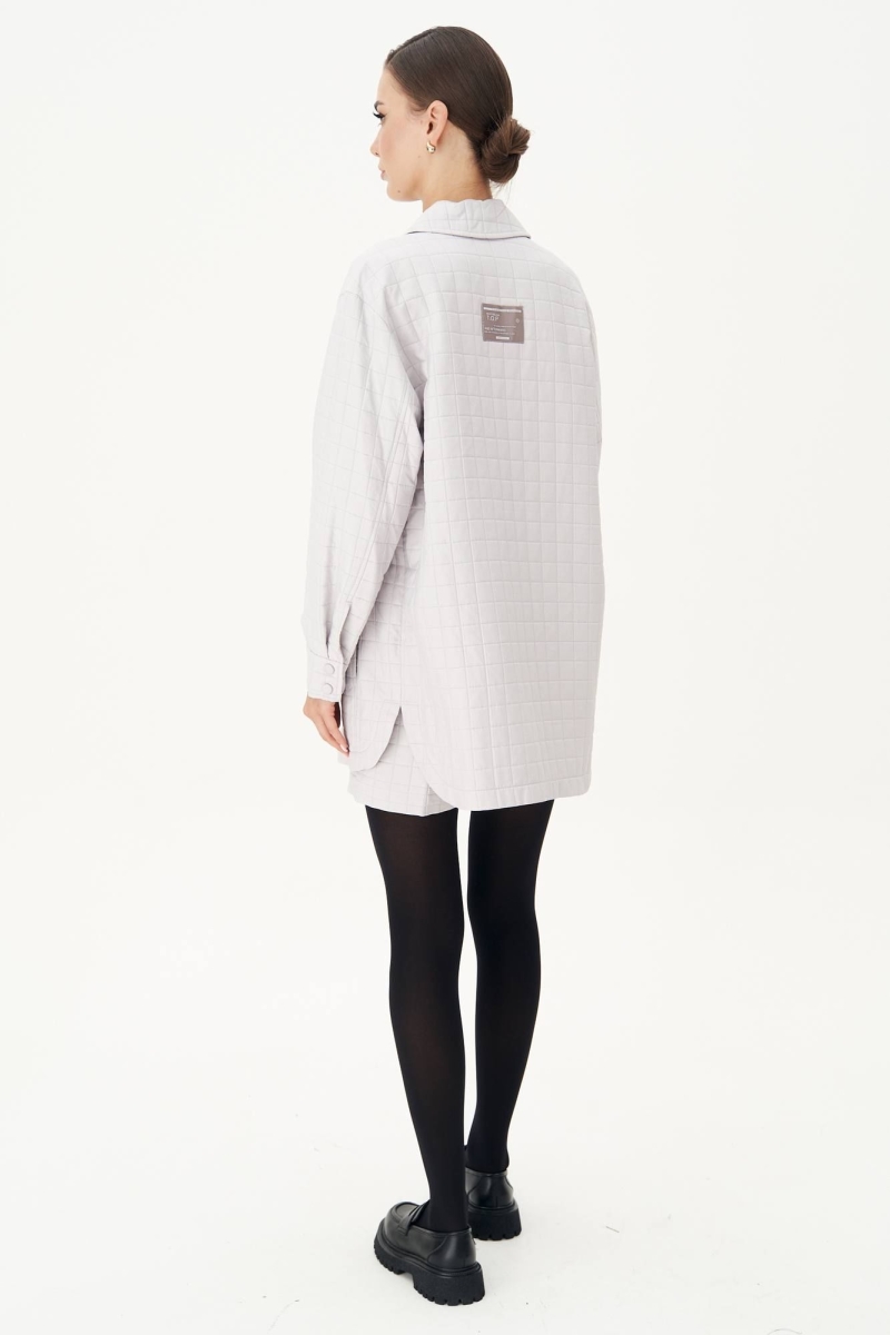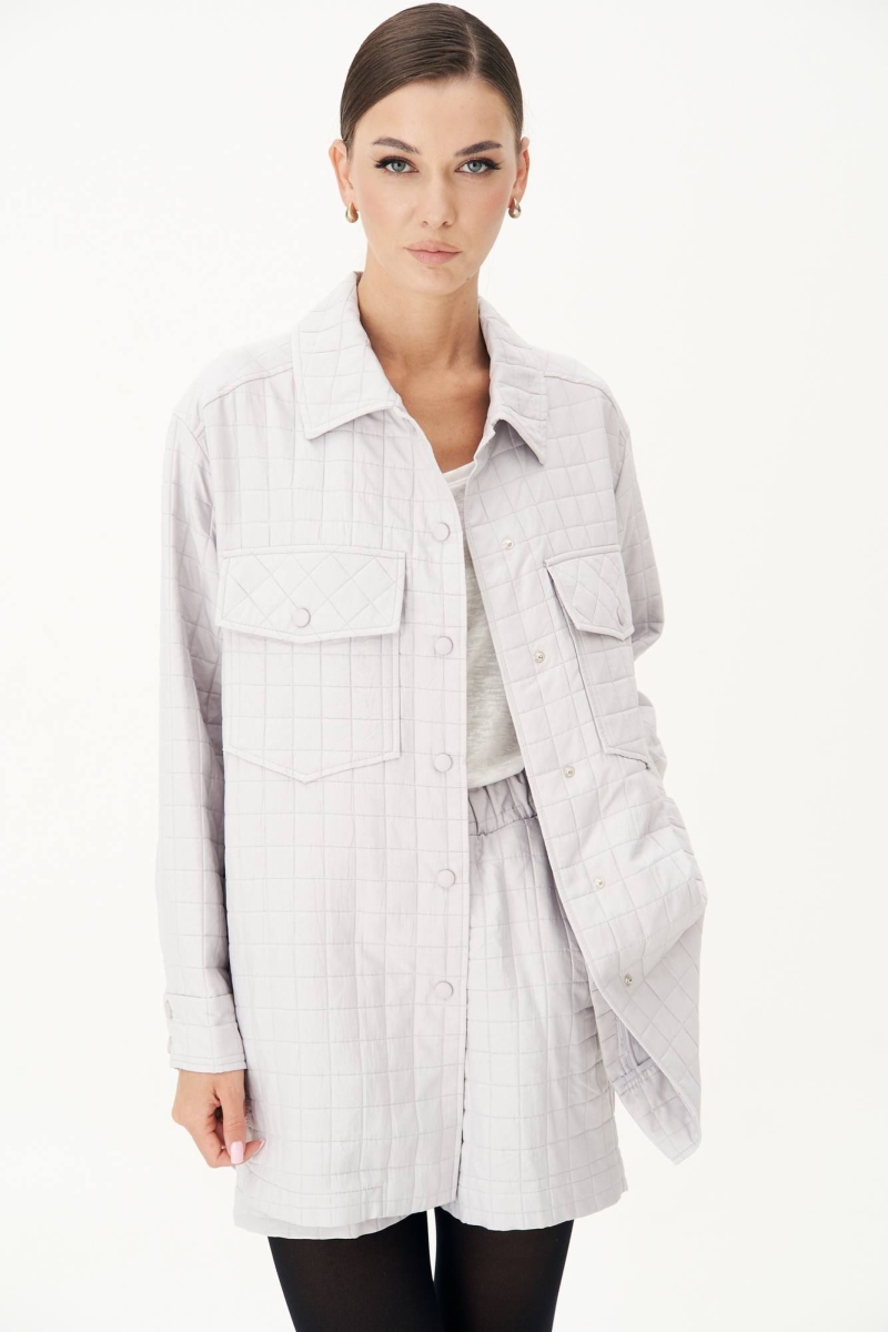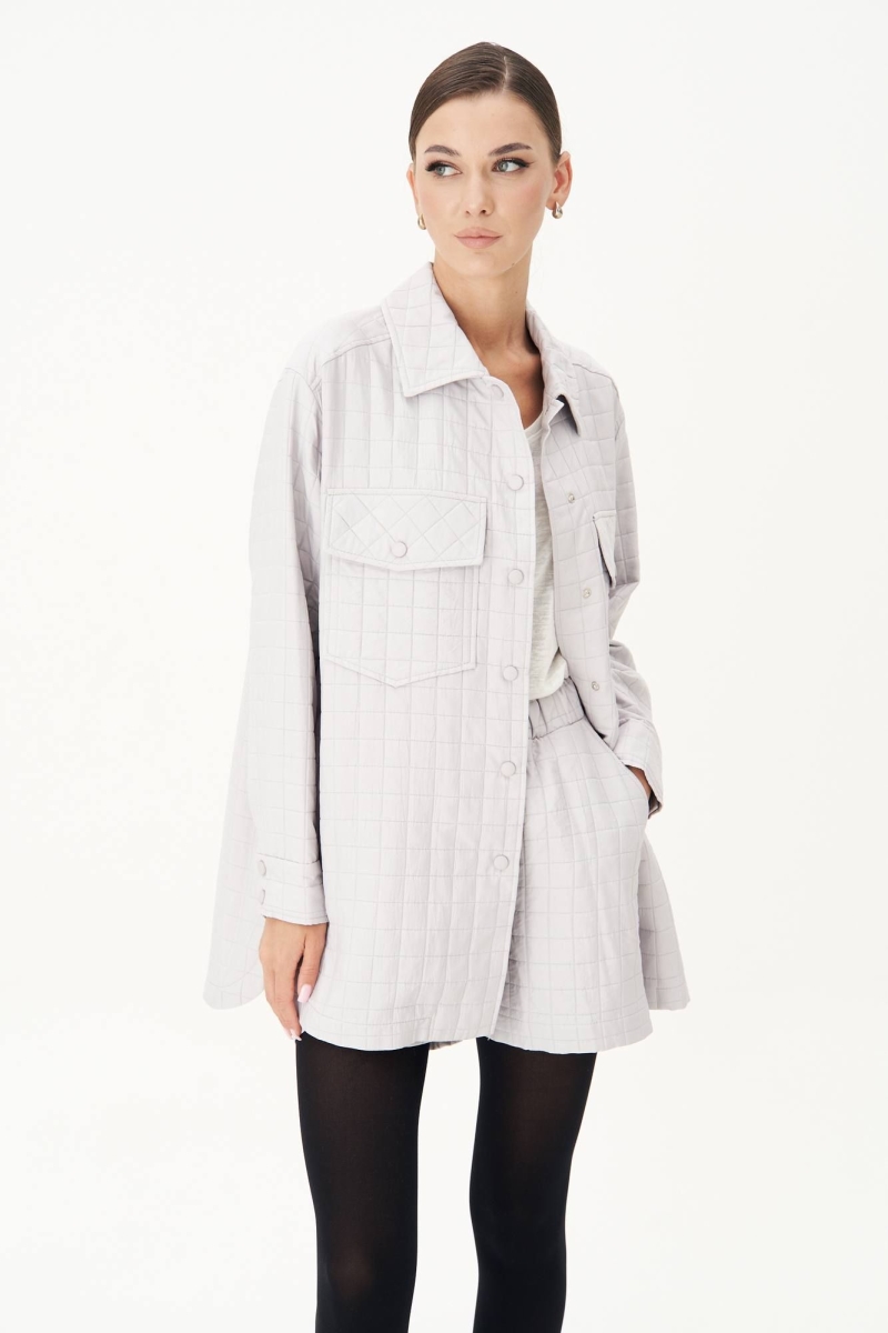 Мода на стеганые вещи набирает обороты и предполагает сногсшибательные образы на весенний сезон! Стеганые юбки и шорты в комплекте с такими же рубашками оверсайз, дополненные гранжевыми ботинками или сапогами-ботфордами – это суперсовременно, смело и эффектно! Рубашка свободного силуэта, рубашечного покроя, с центральной застежкой на петли и пуговицы, рубашечным рукавом на притачной манжете и стояче-отложным воротником.